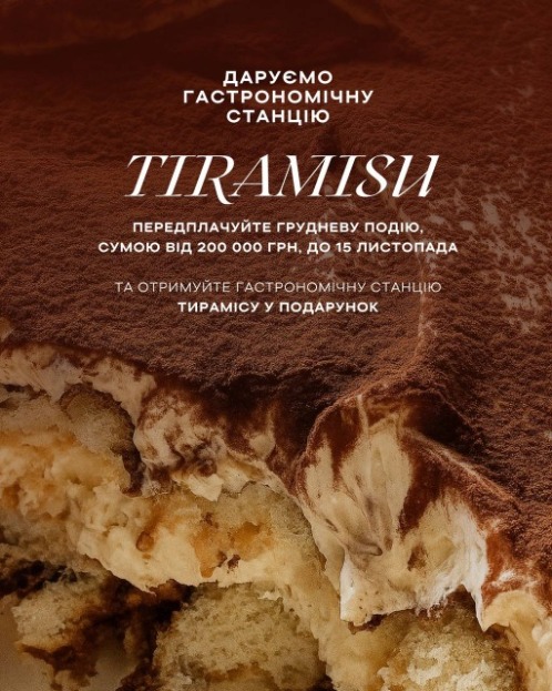 Передплачуйте грудневу послугу кейтерингу, загальним чеком від 200 000 грн, до 15 листопада — та отримайте гастрономічну станцію Tiramisu у подарунок.