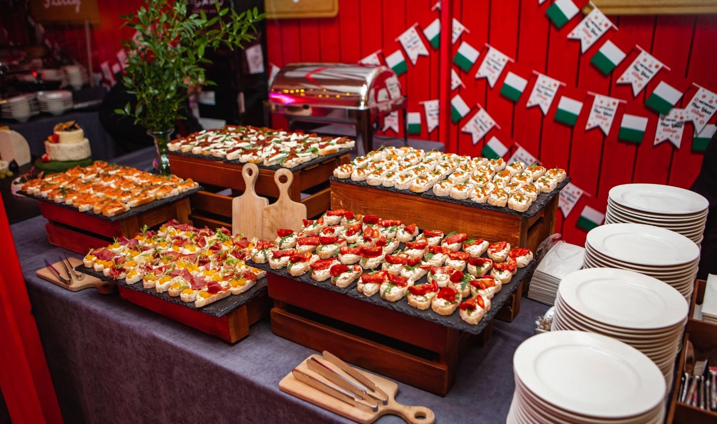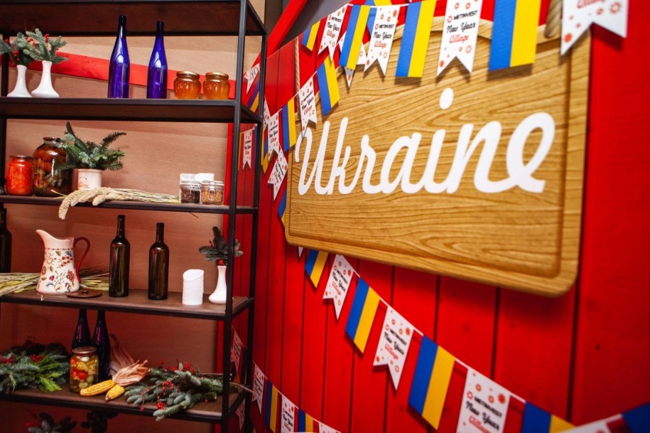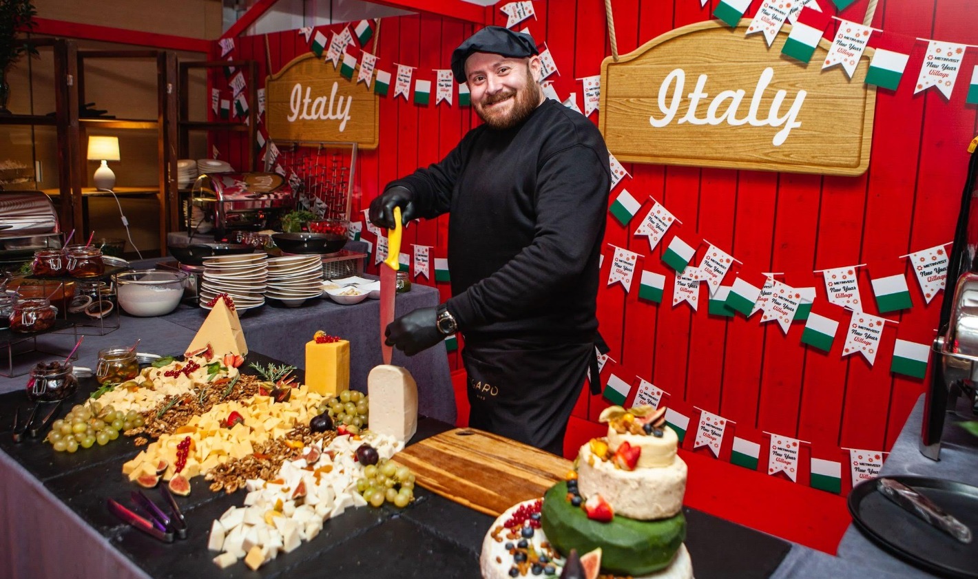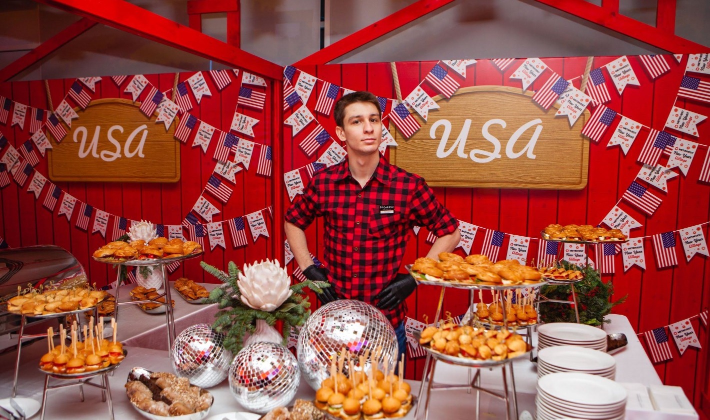 Зона основного фуршета была представлена мини-домиками с прилавками национальных угощений 5-ти стран: Украины, Америки, Англии, Италии, Болгарии.