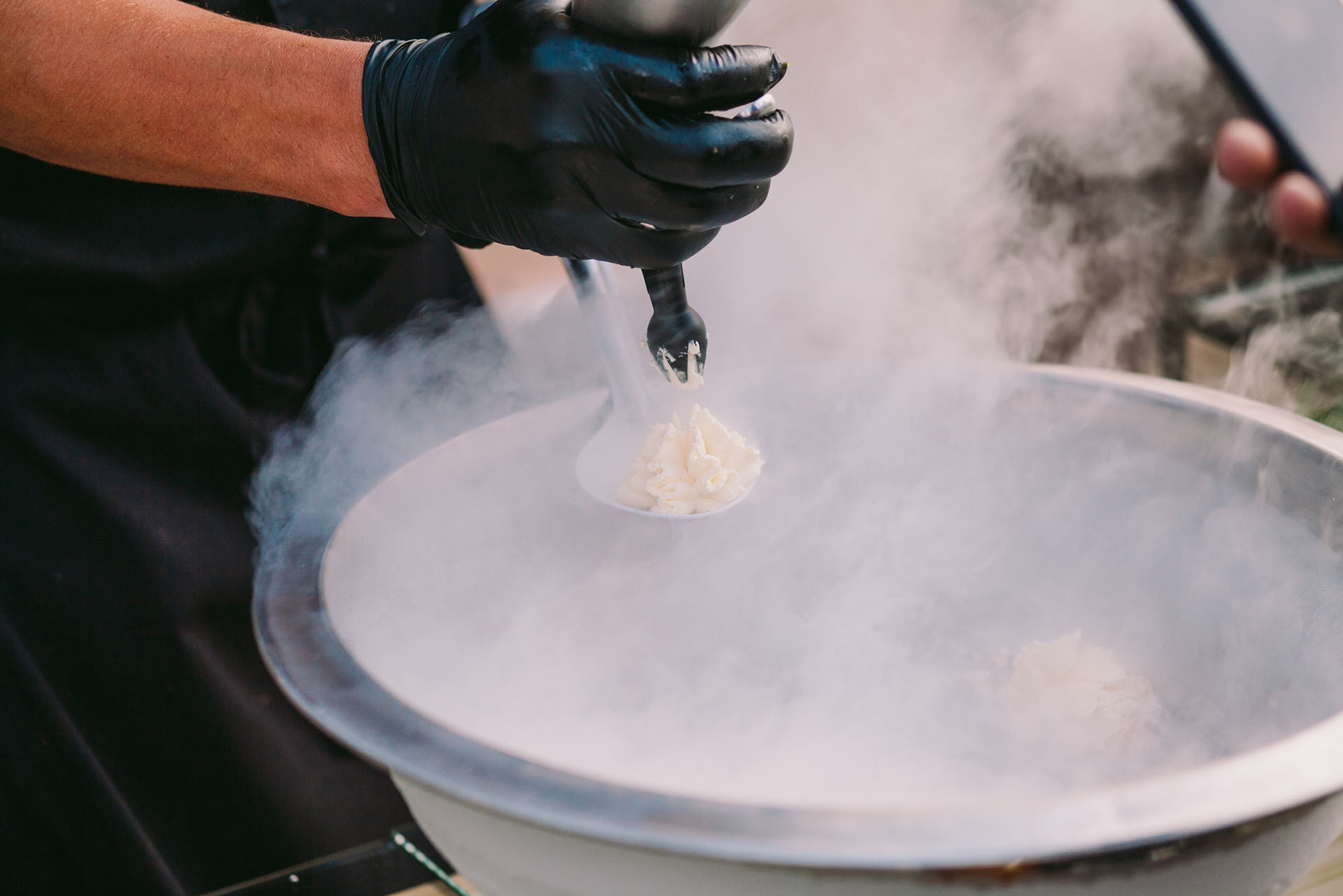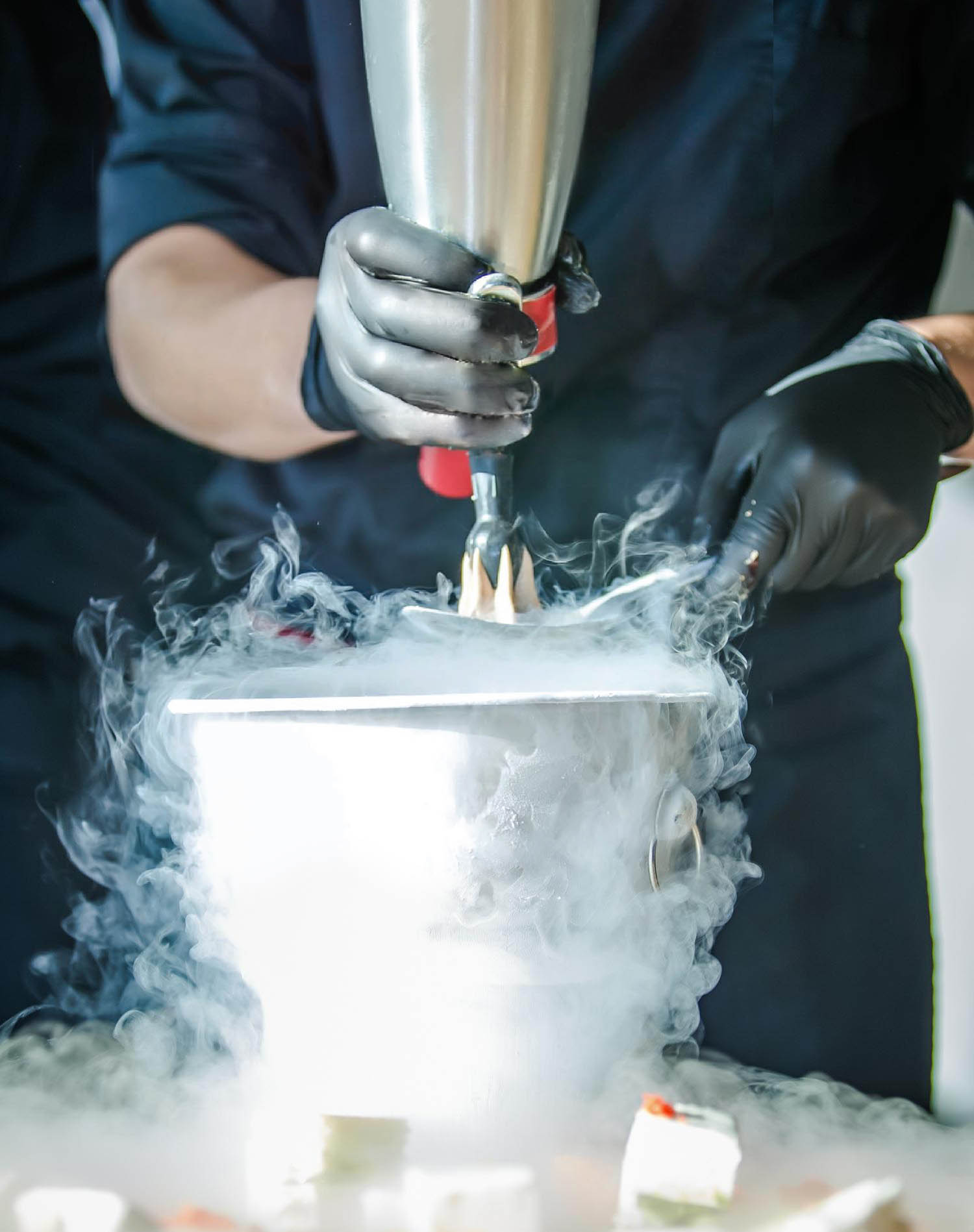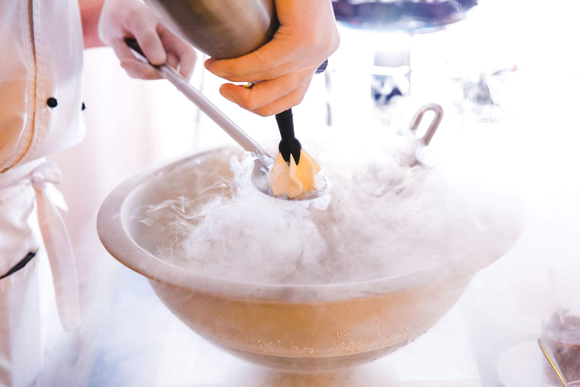 В присутствии гостей повар готовит очень необычный десерт. Сливочное мороженое с легким привкусом алкоголя повар заливает жидким азотом, после чего мороженое становится хрустящим снаружи и мягкими внутри. Это изысканное лакомство идеально украсит Ваше событие и впечатлит гостей!