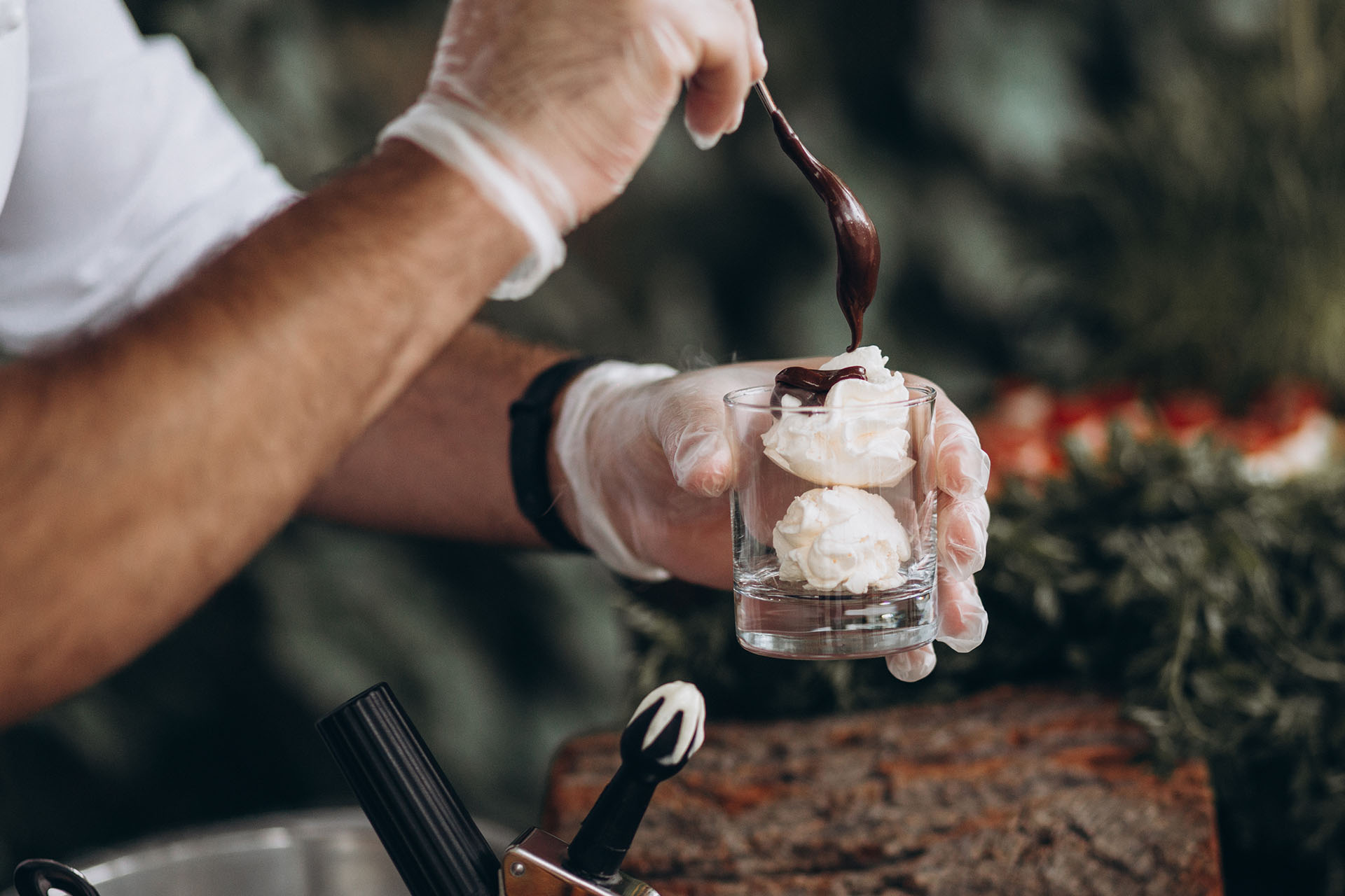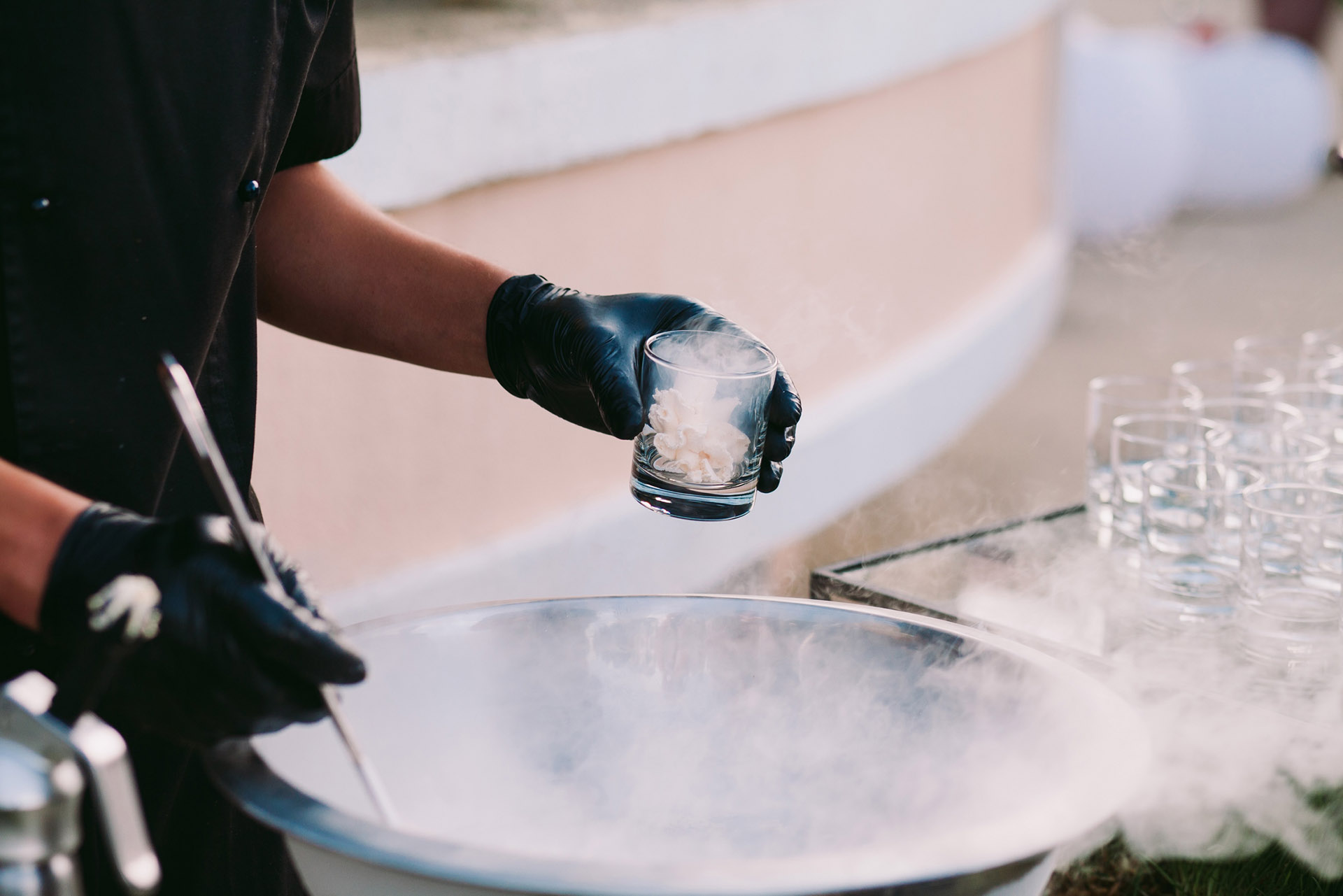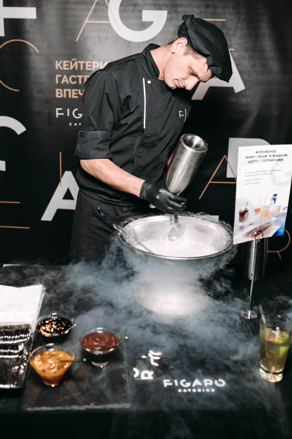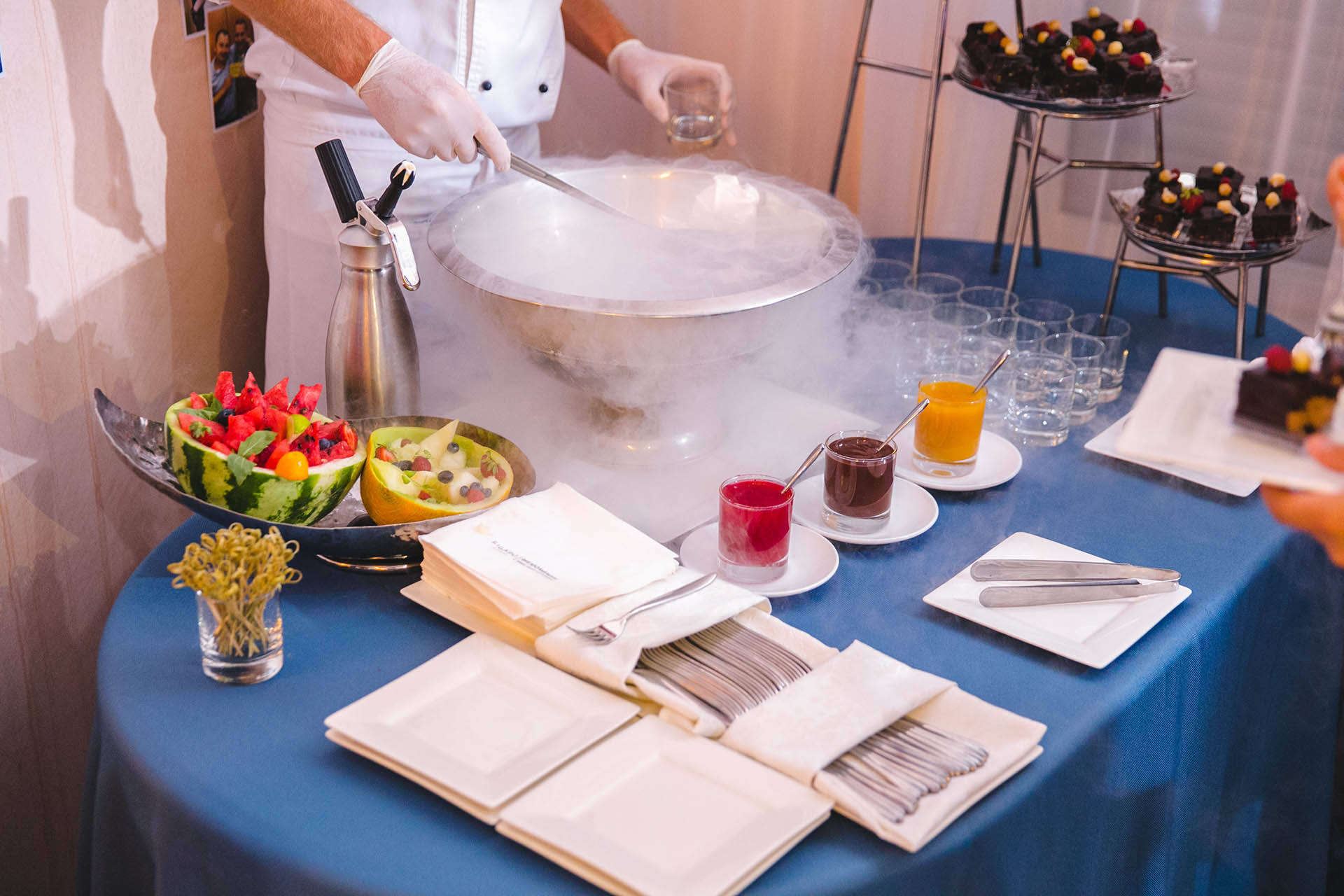 В присутствии гостей повар готовит очень необычный десерт. Сливочное мороженое с легким привкусом алкоголя повар заливает жидким азотом, после чего мороженое становится хрустящим снаружи и мягкими внутри. Это изысканное лакомство идеально украсит Ваше событие и впечатлит гостей!