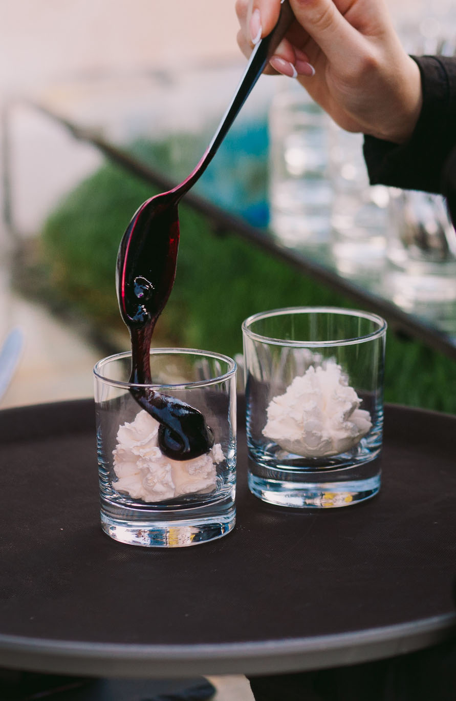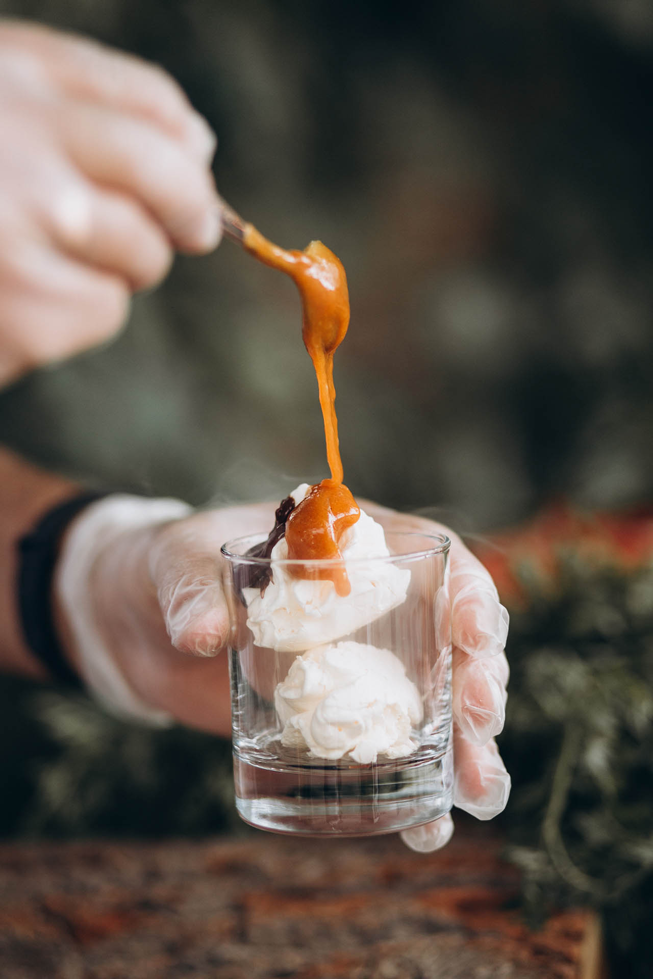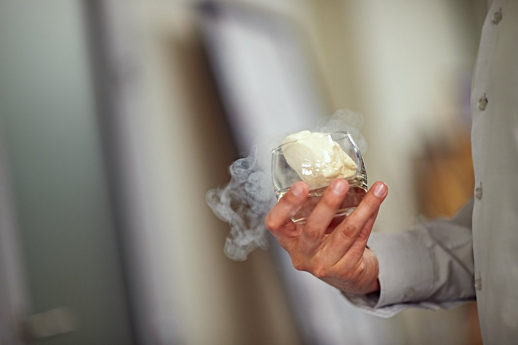 Сливочное мороженое с легким привкусом алкоголя повар заливает жидким азотом, после чего мороженое становится хрустящим снаружи и мягкими внутри.