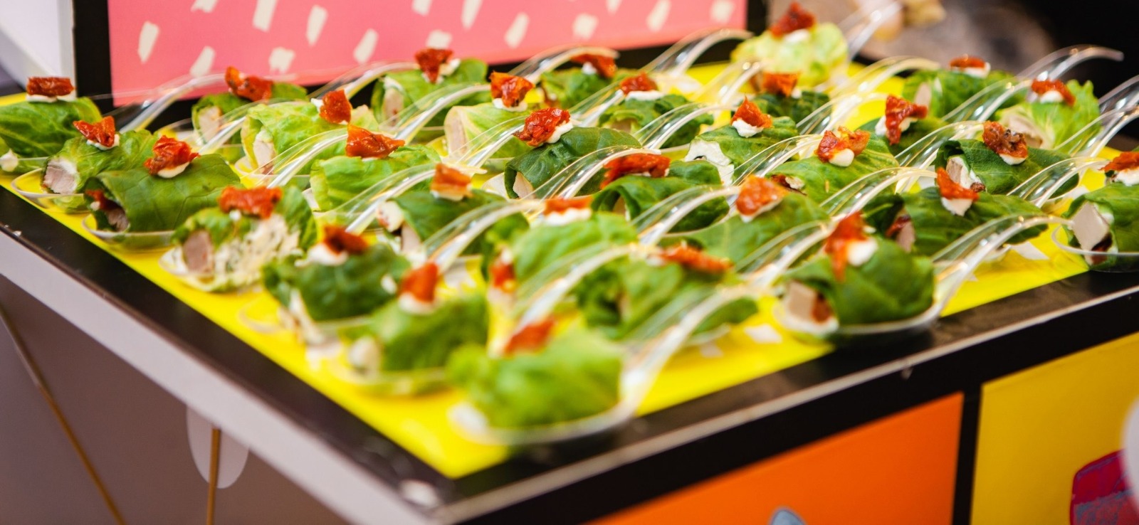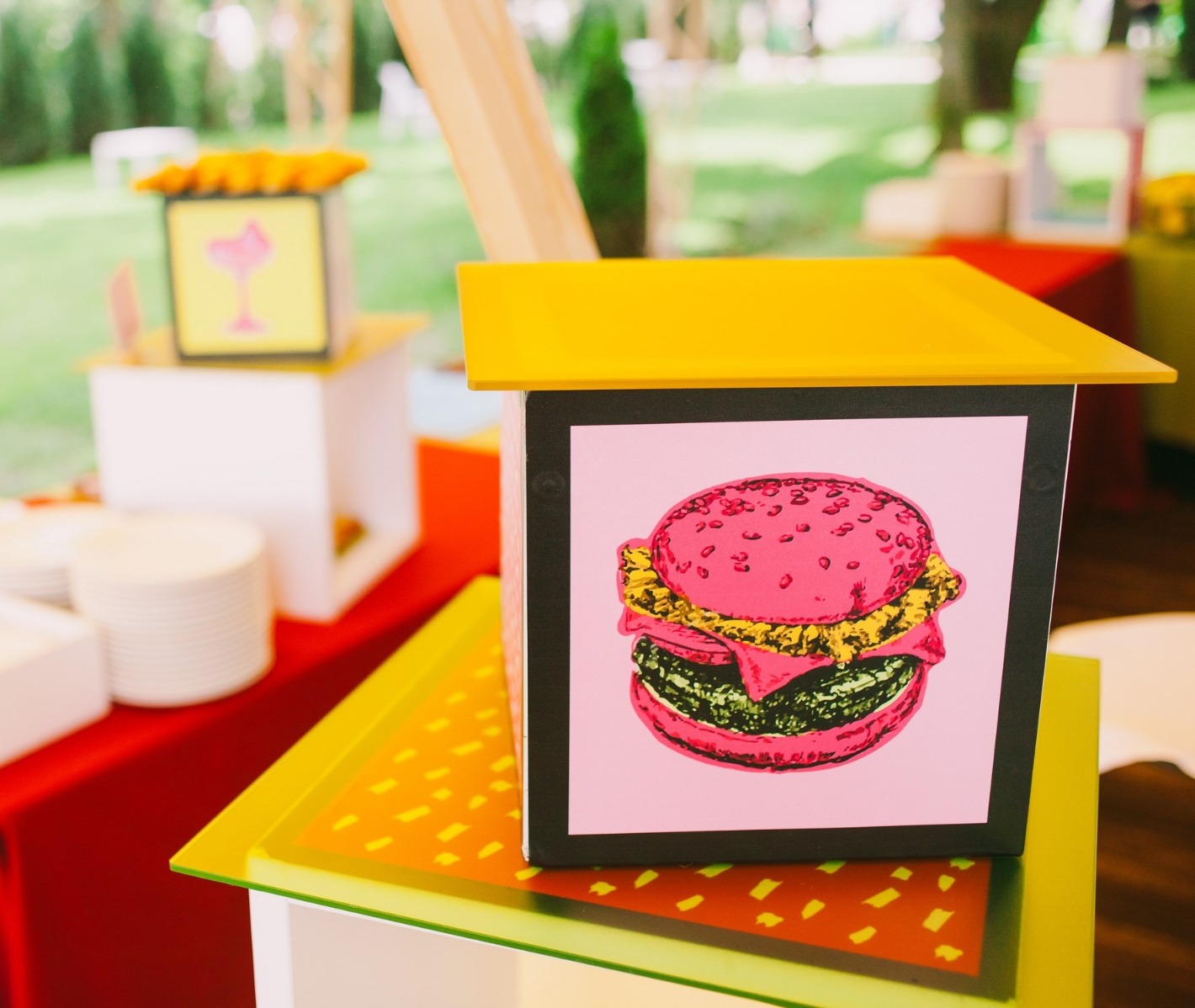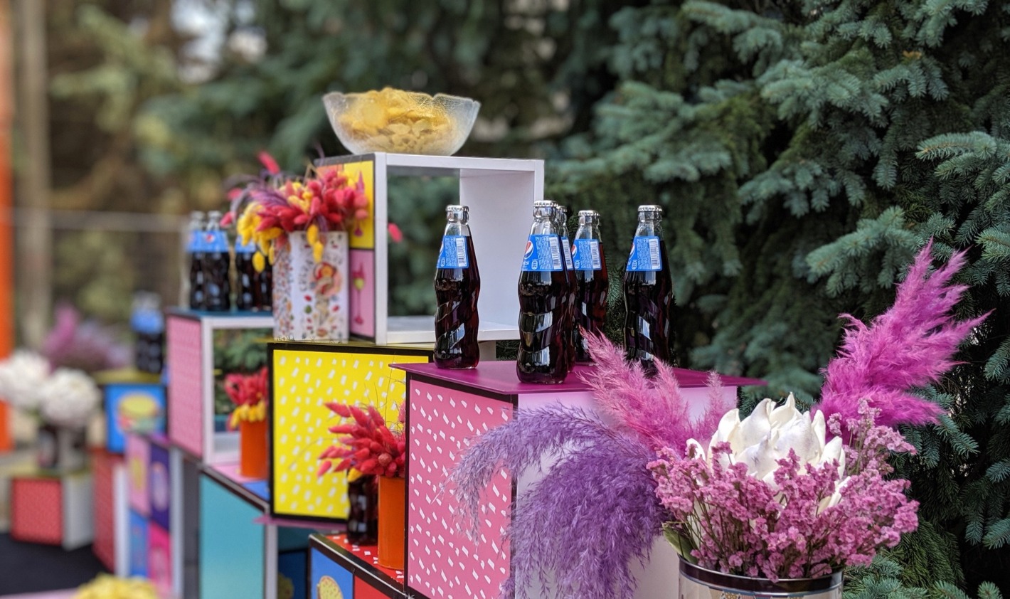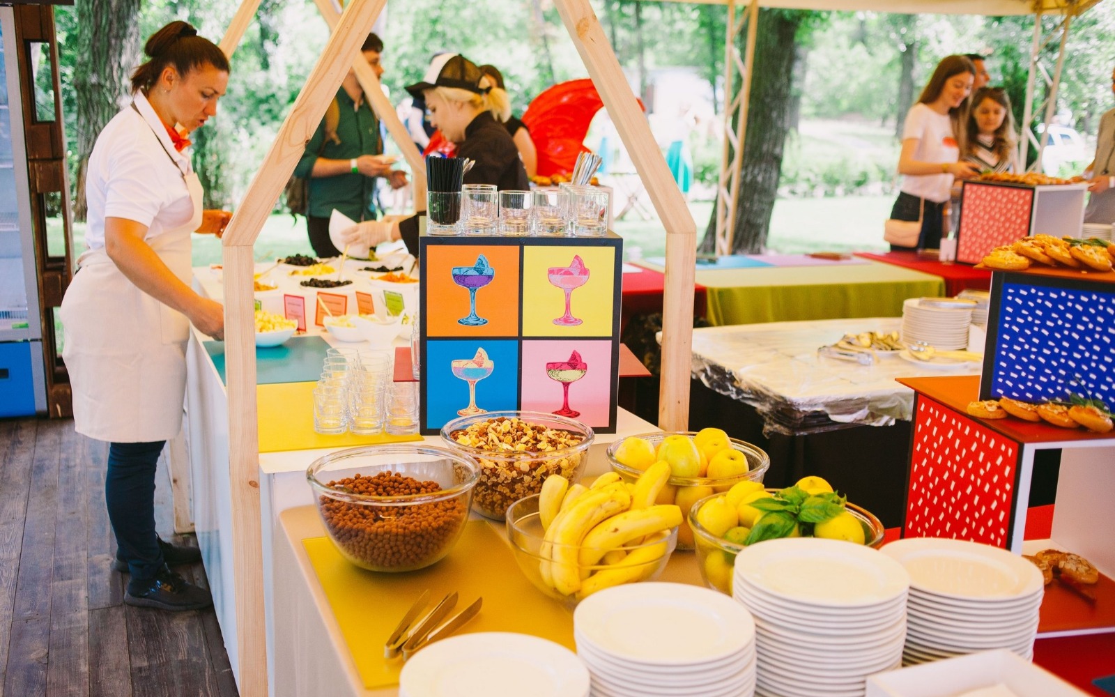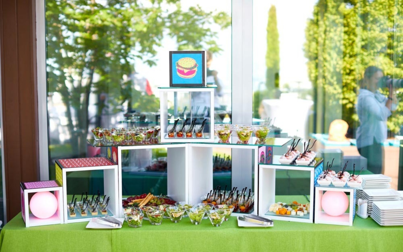 Угощения подаются на цветном стекле, а также wonder box, задекорированных цветными фотокартинами.