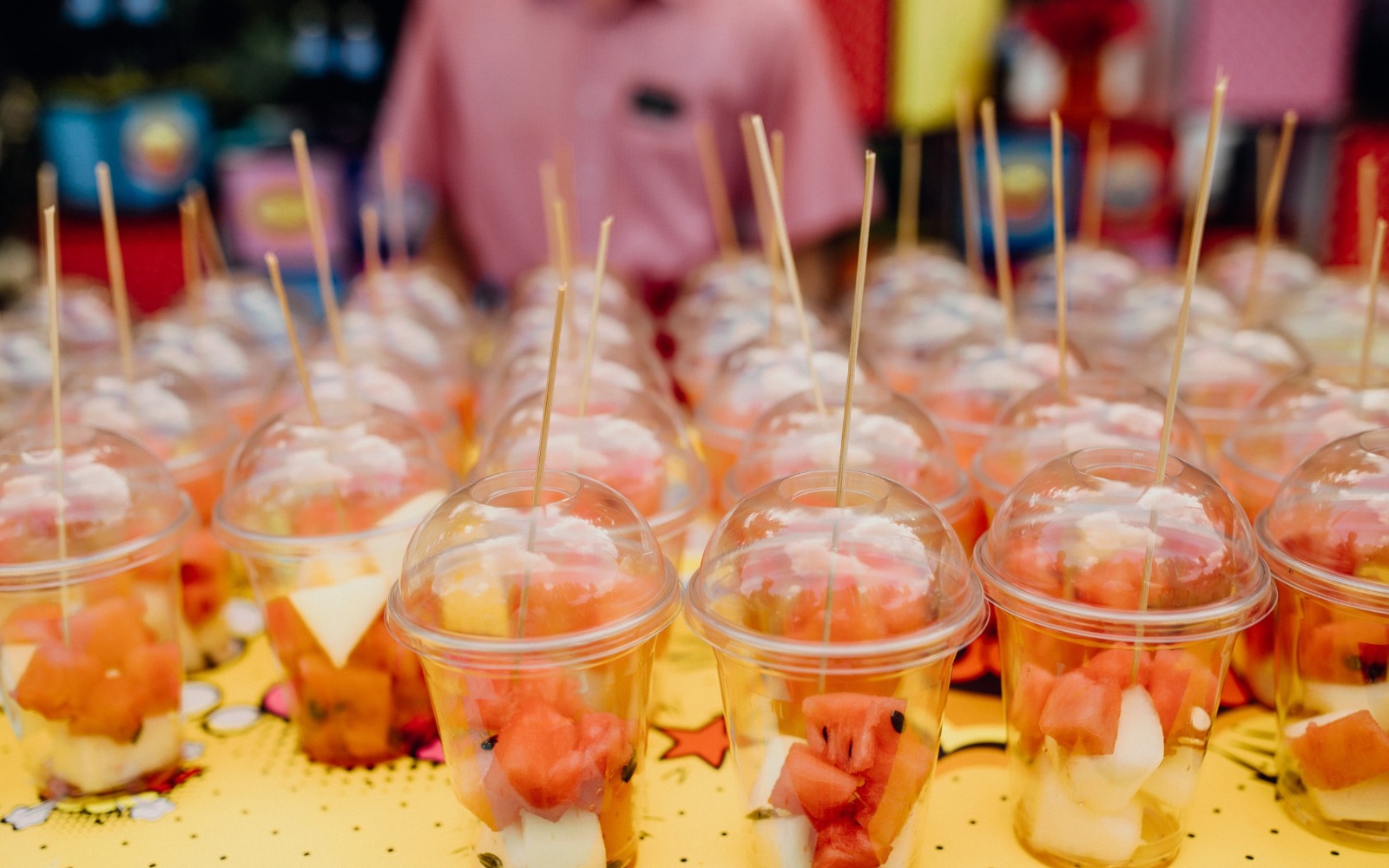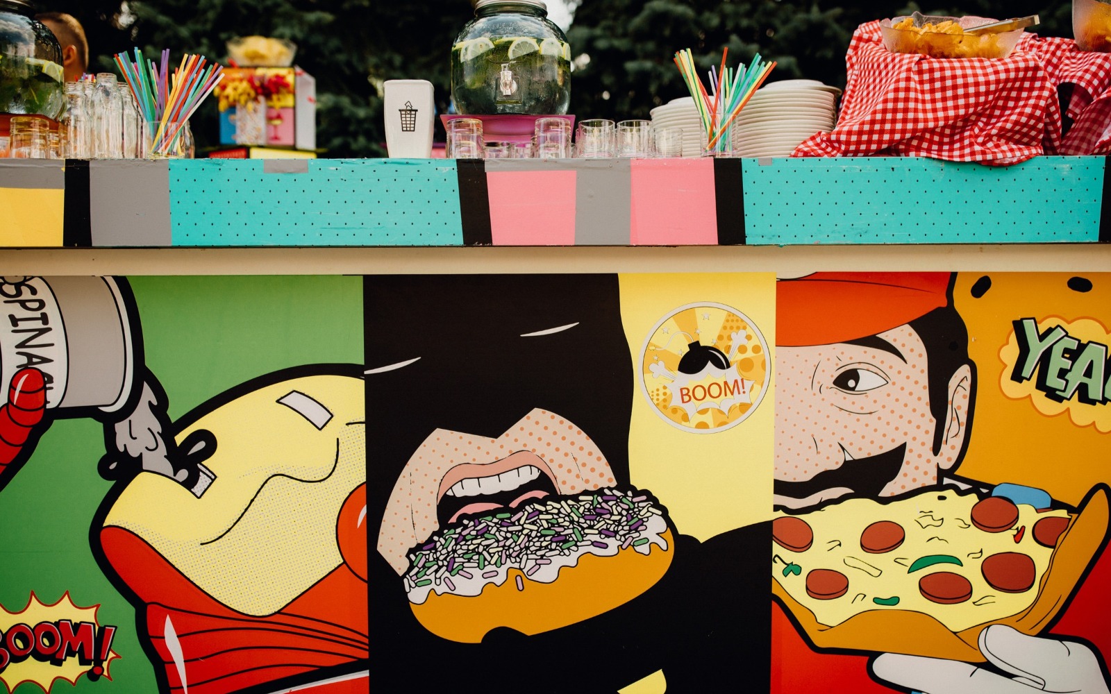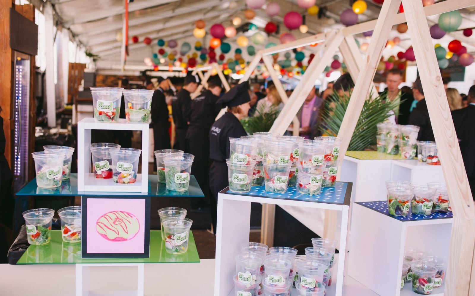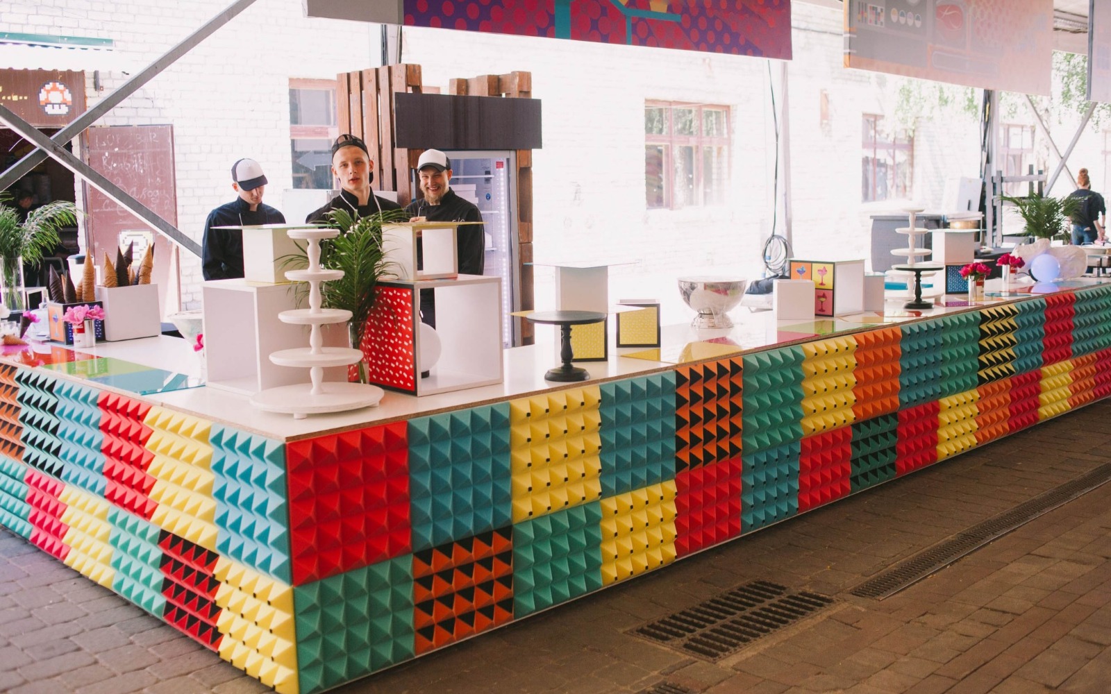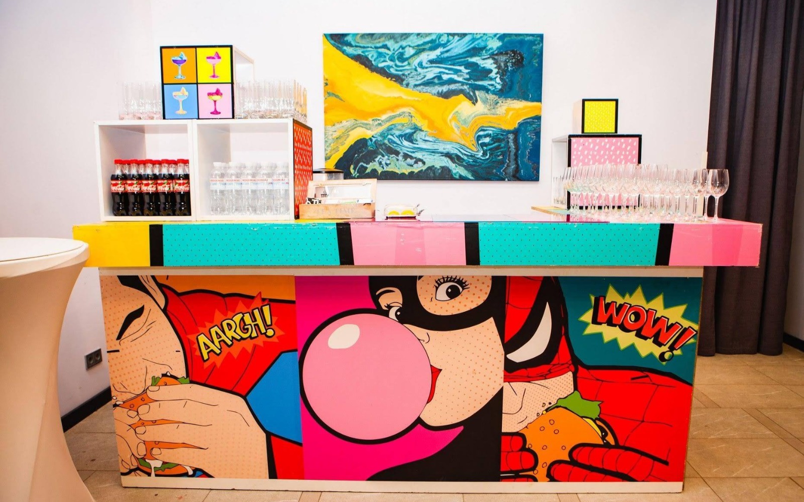 Угощения подаются на цветном стекле, а также wonder box, задекорированных цветными фотокартинами.