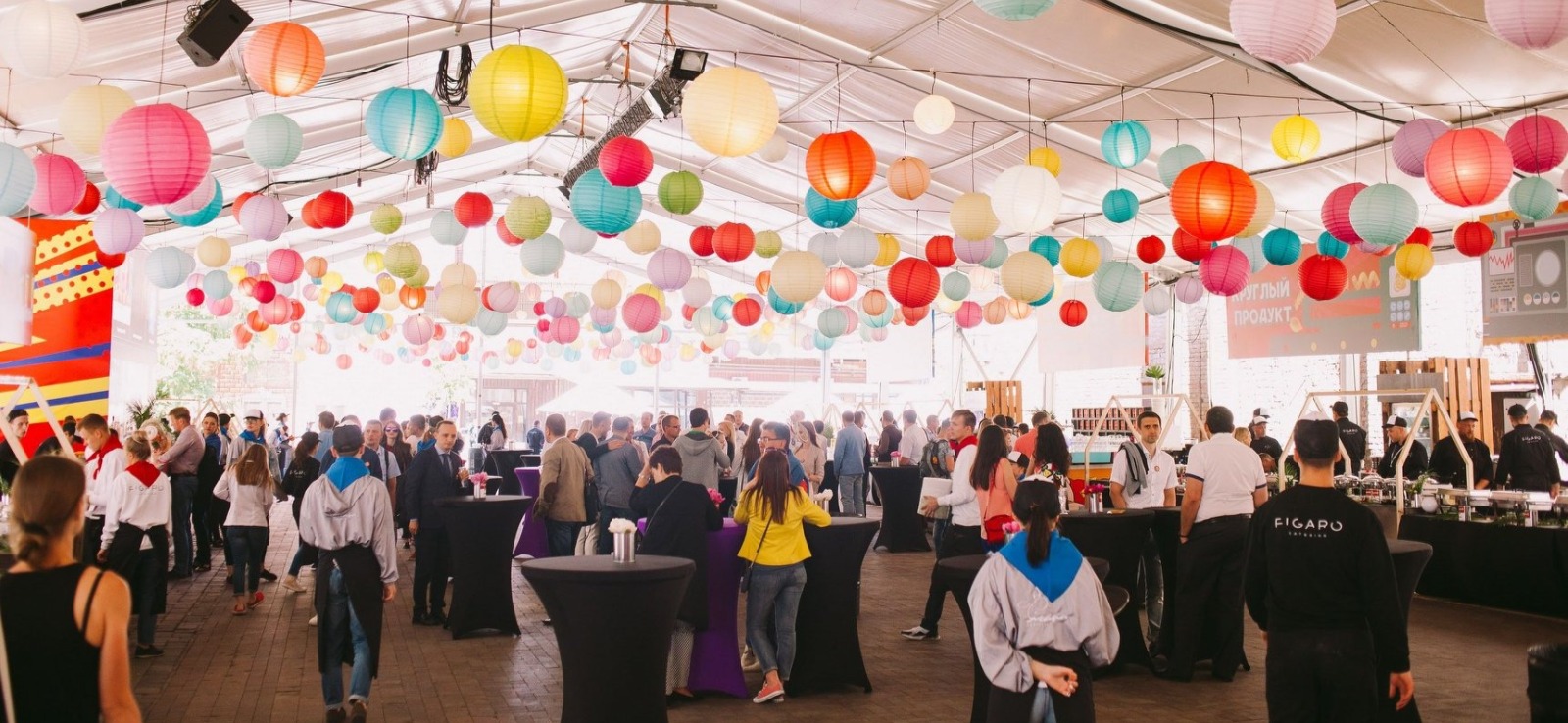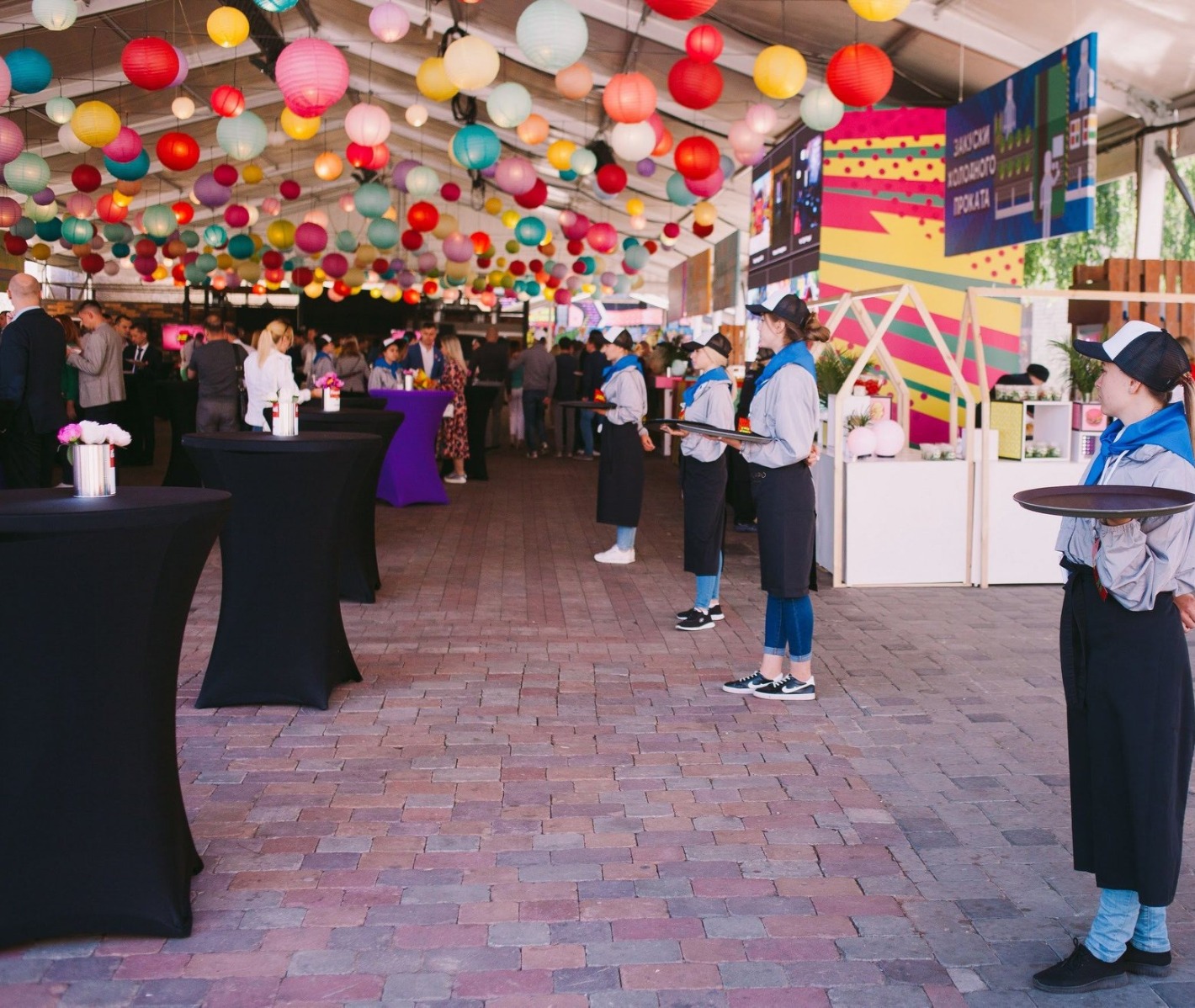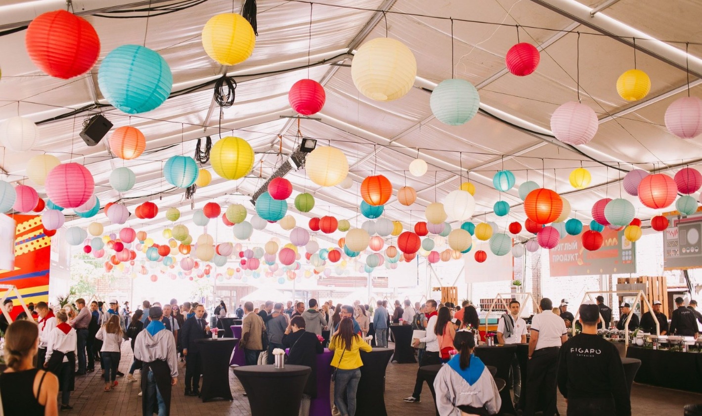Зона Кейтеринга декорируется цветочными композициями и разноцветными светящимися шарами.