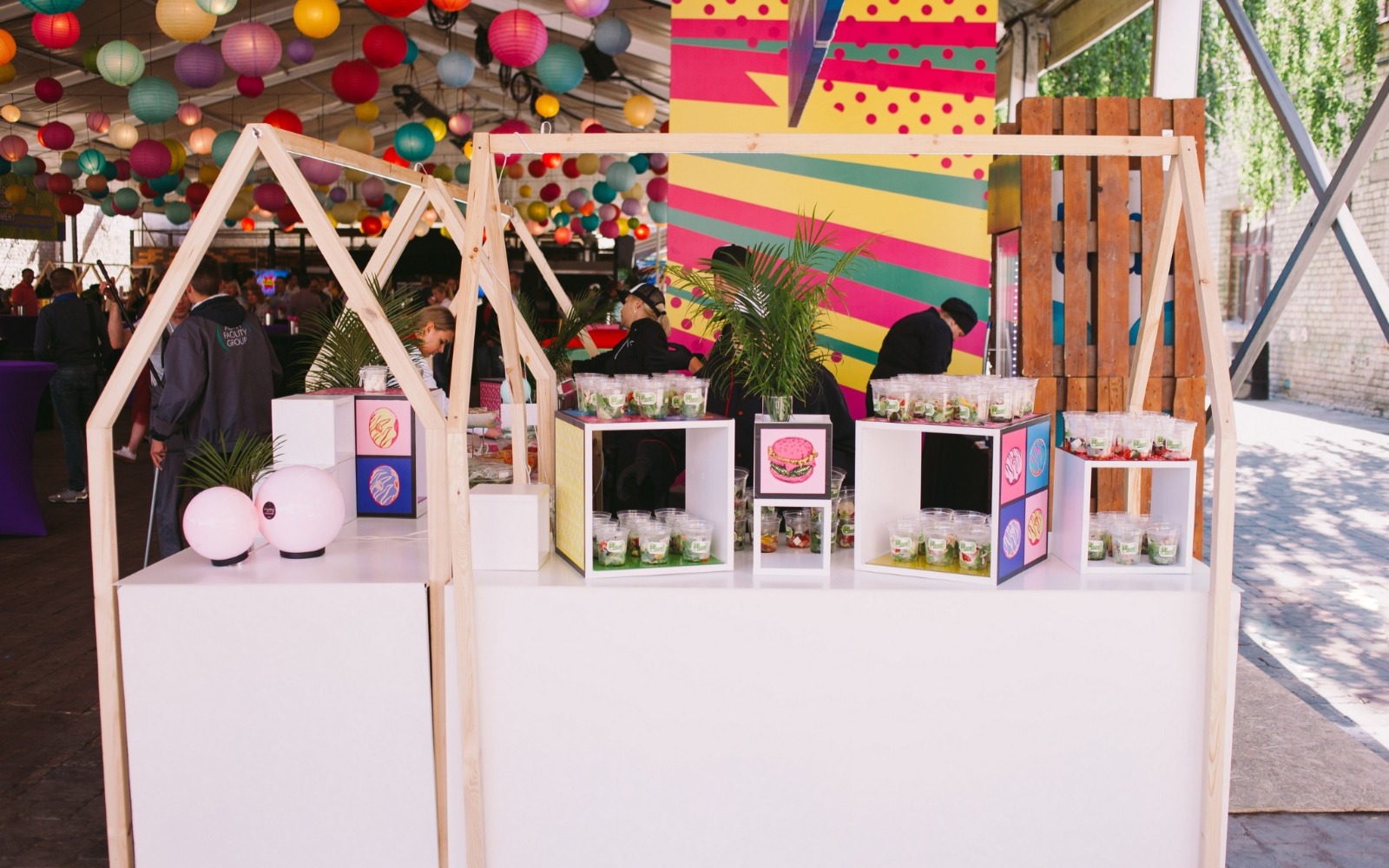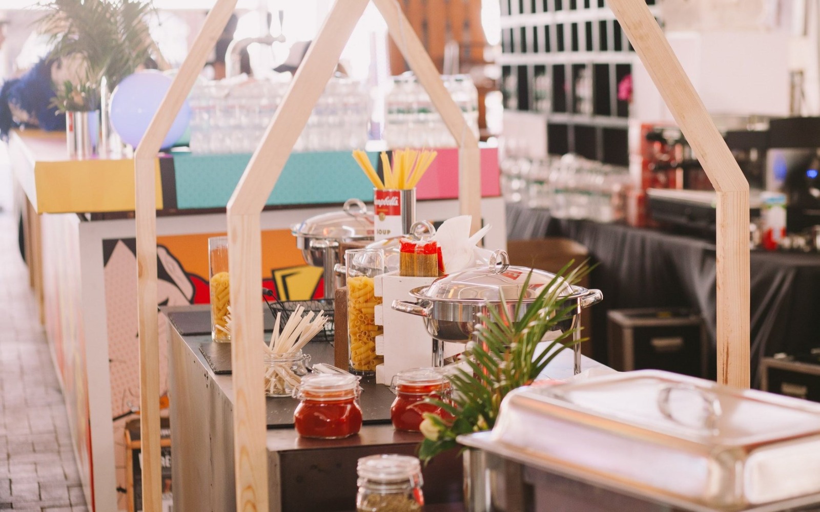Фуршетная линия создает эффект 3D-дома с абстрактной крышей и светящимися бликами. Также можно оформить фуршетную линию в стиле #push из разноцветного паралона. Добавляет Вашему событию яркости и экзотики.
