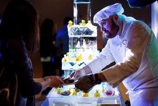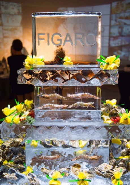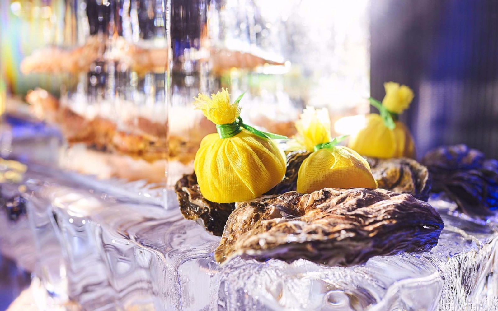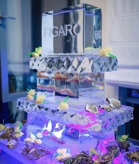 На ледяной многоуровневой пирамиде с замороженными креветками, подаются устрицы Fine de Claire, которые повар вскрывает и подает гостям под лимонным соком или устричным соусом. На верхнем ярусе ледяной пирамиды можно разместить лого компании-организатора. Это позволит усилить корпоративные проявления компании на мероприятии