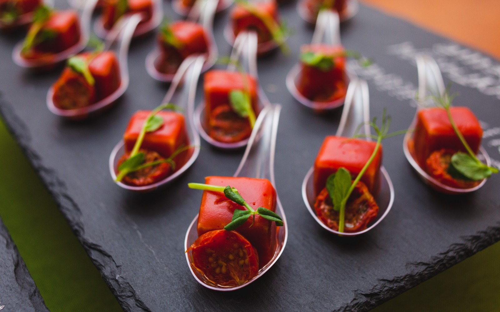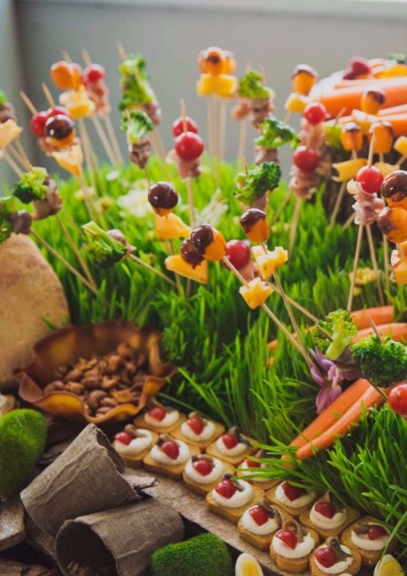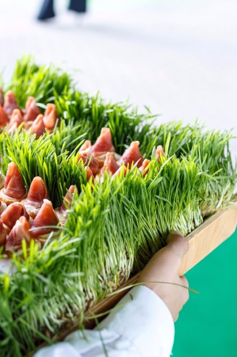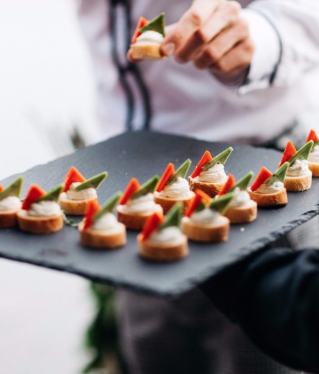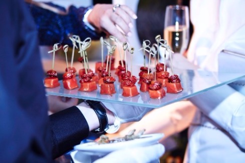 Напитки и закуски официанты подают гостям в обнос, закуски фингер фуд – дает возможность сьесть за один прикус и не требует использовать вил