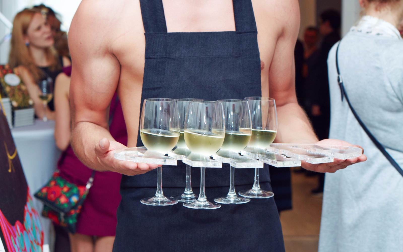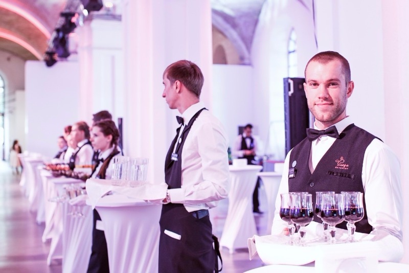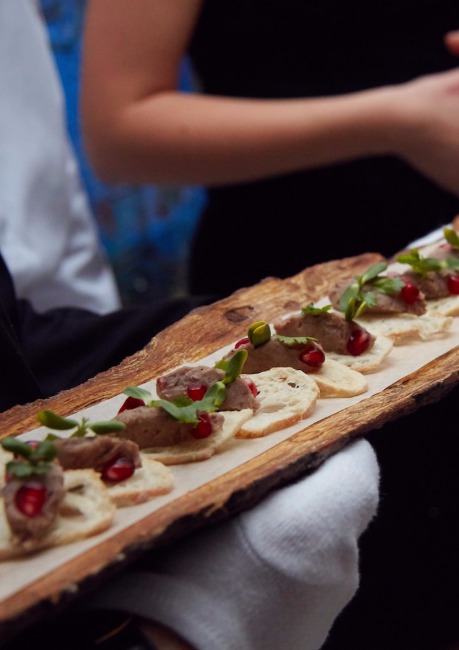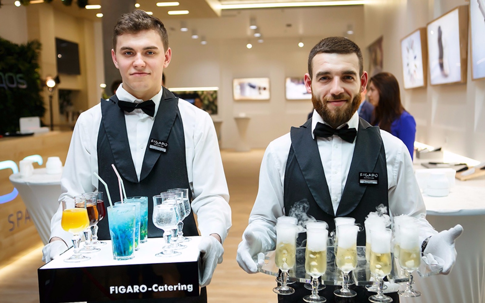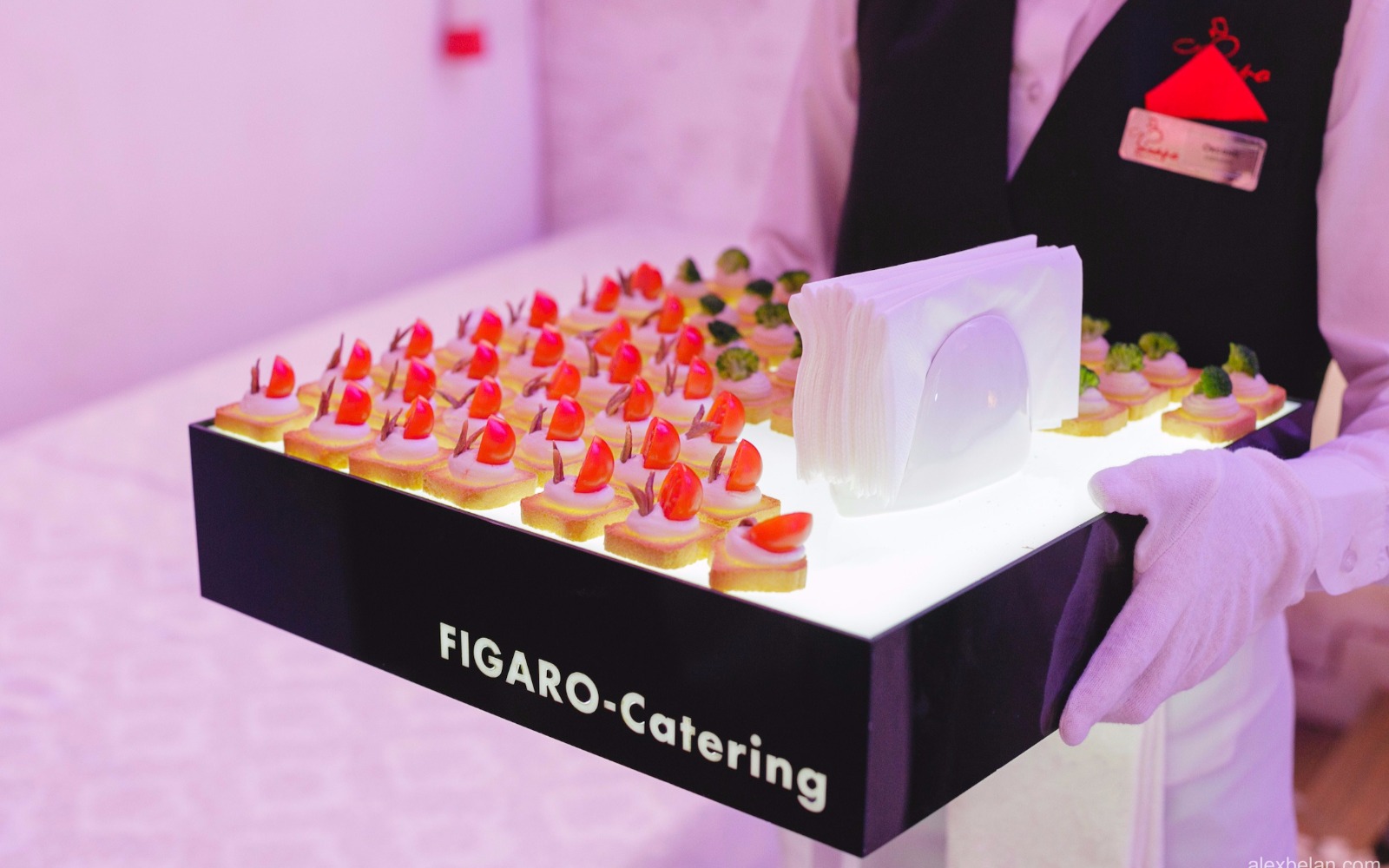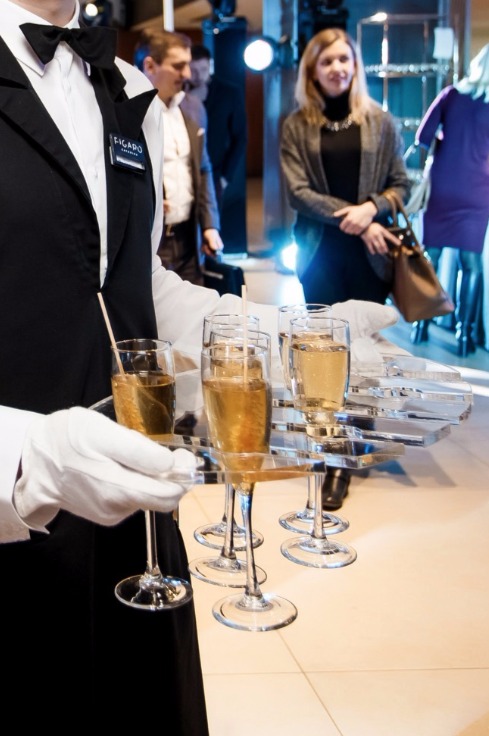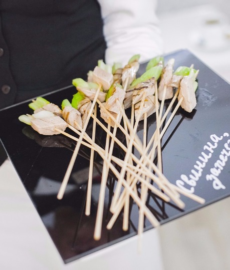 Напитки и закуски официанты подают гостям в обнос. Такой формат предполагает удобные небольшие закуски на один укус и исключает использование фраже