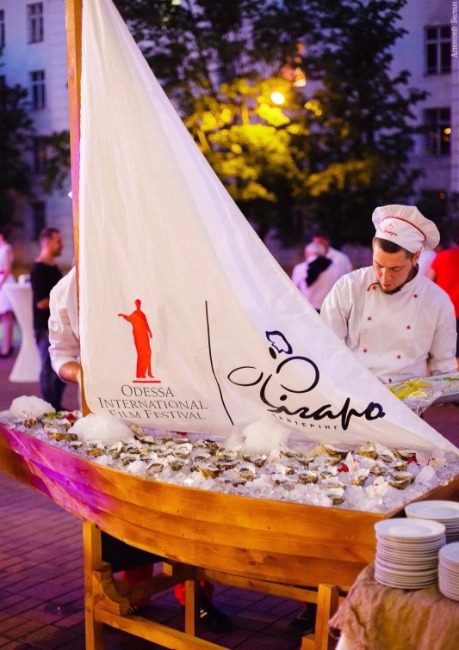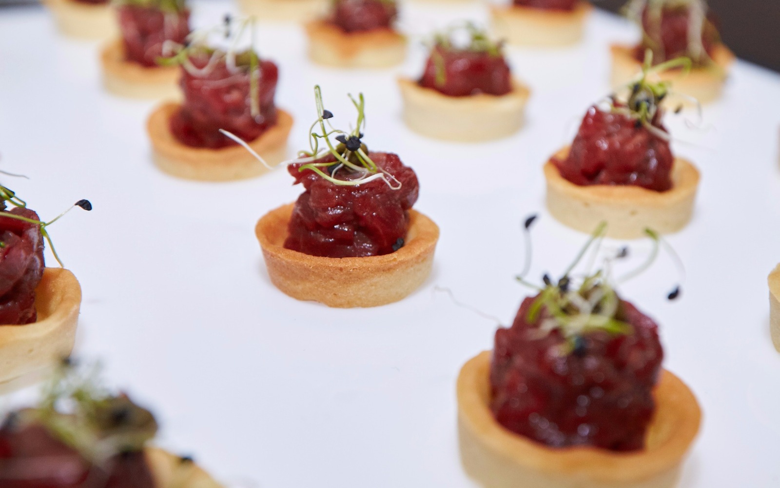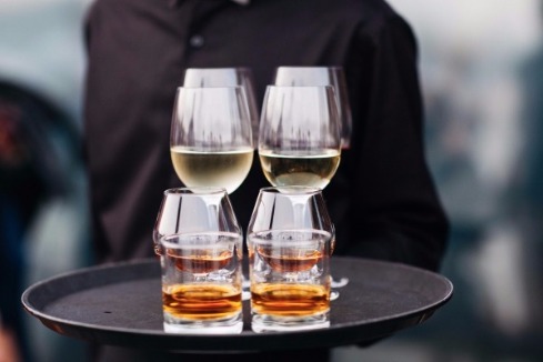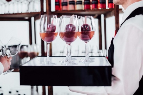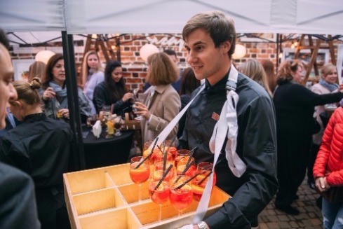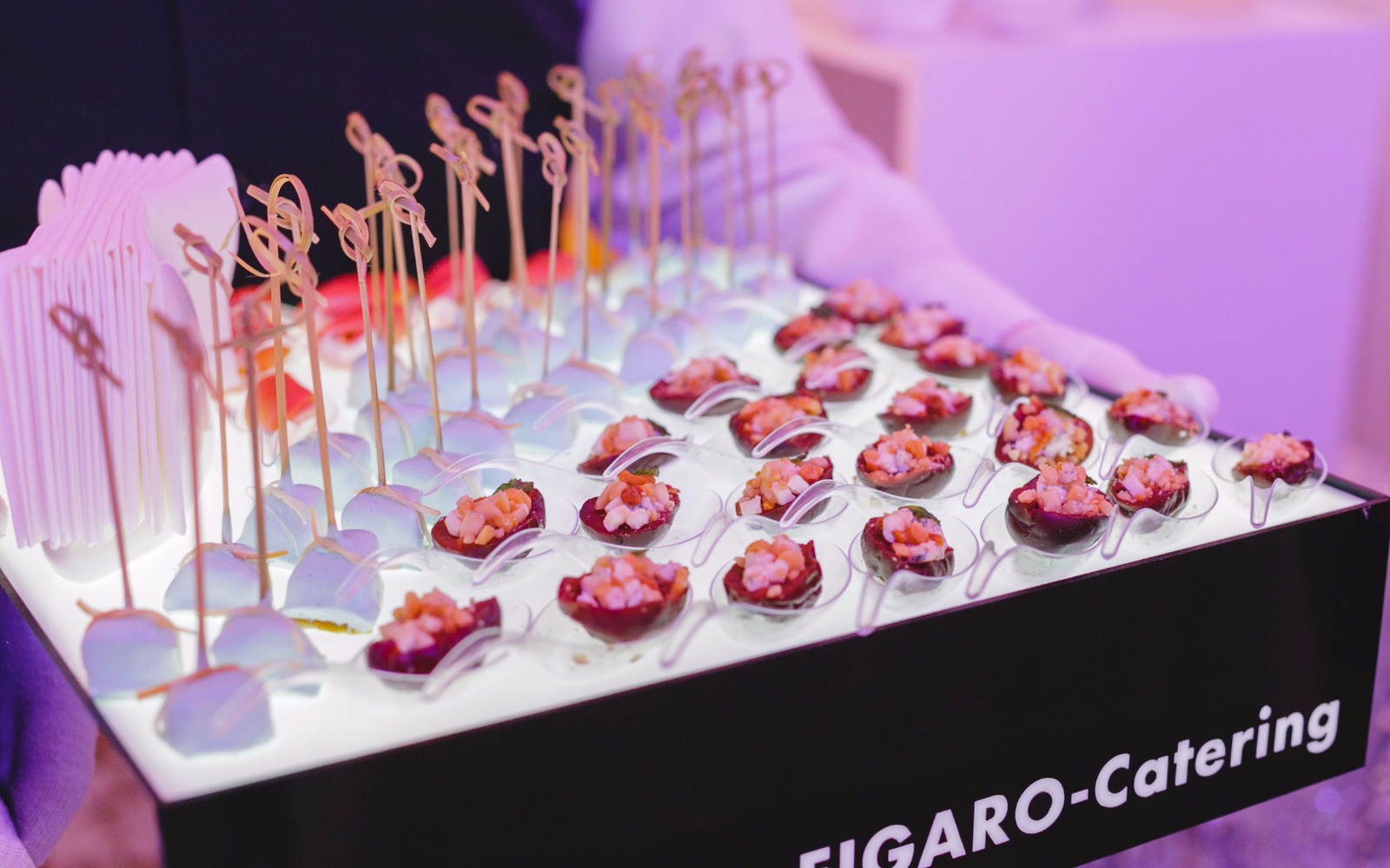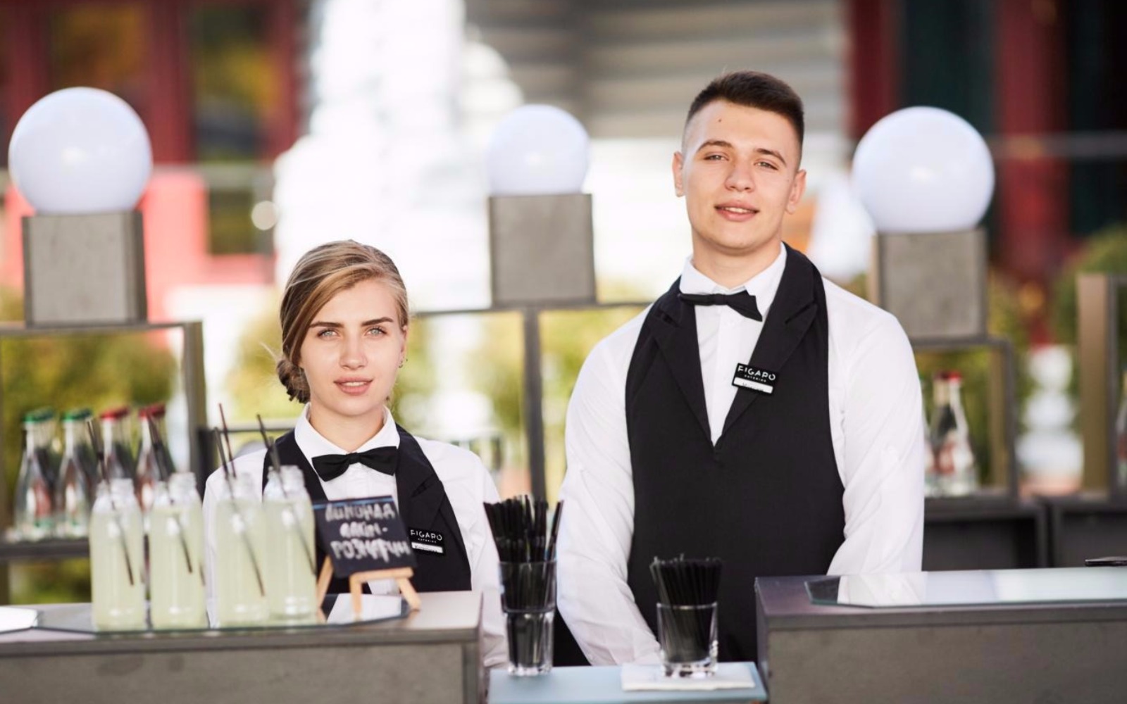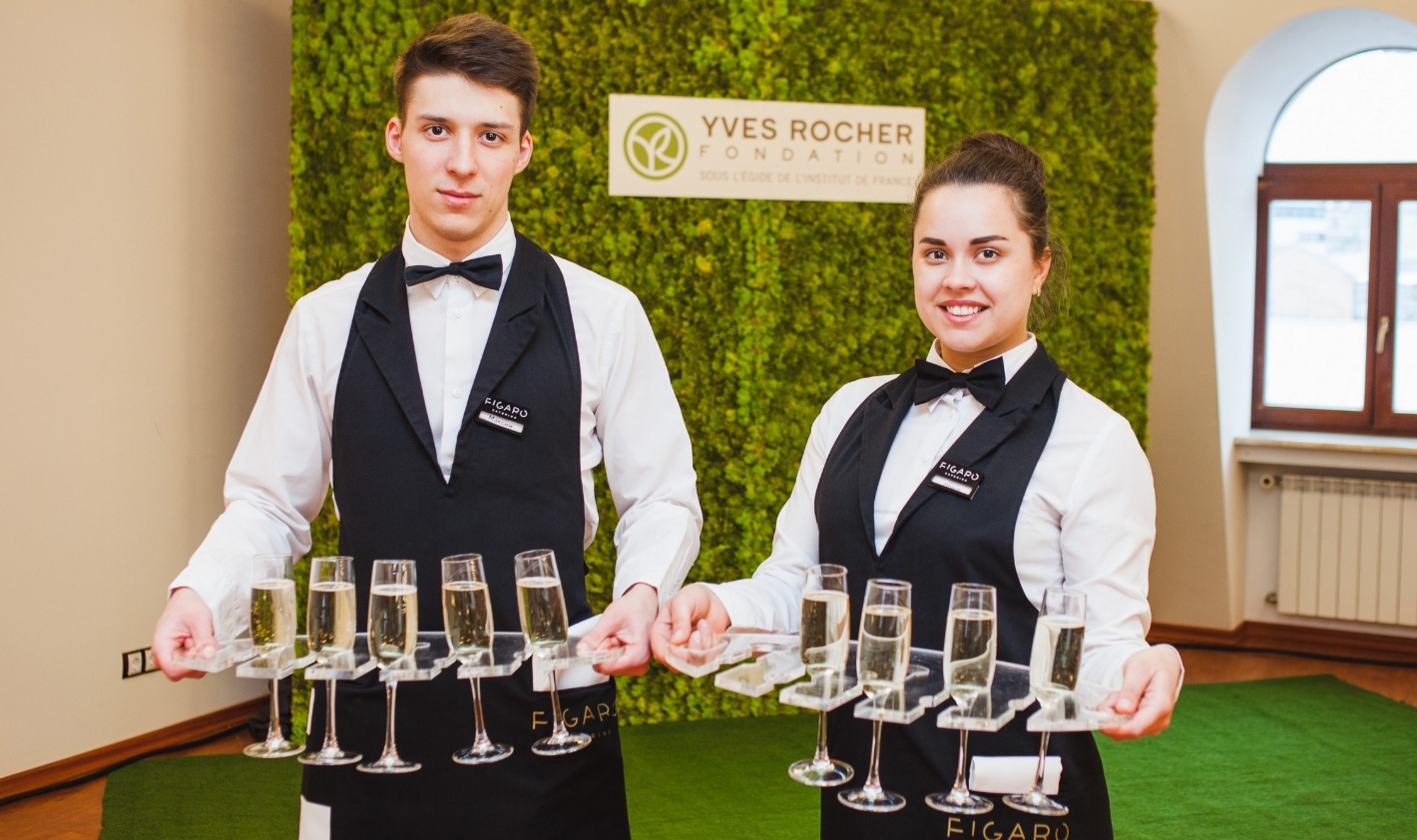 Напитки и закуски официанты подают гостям в обнос. Такой формат предполагает удобные небольшие закуски на один укус и исключает использование фраже