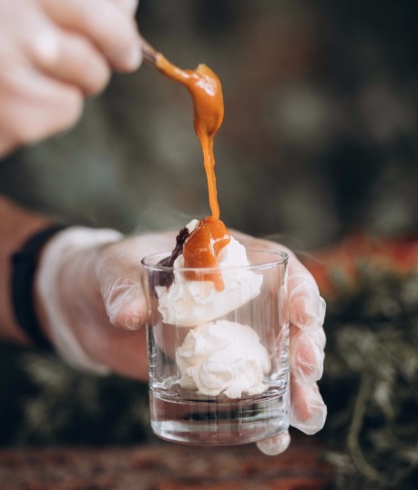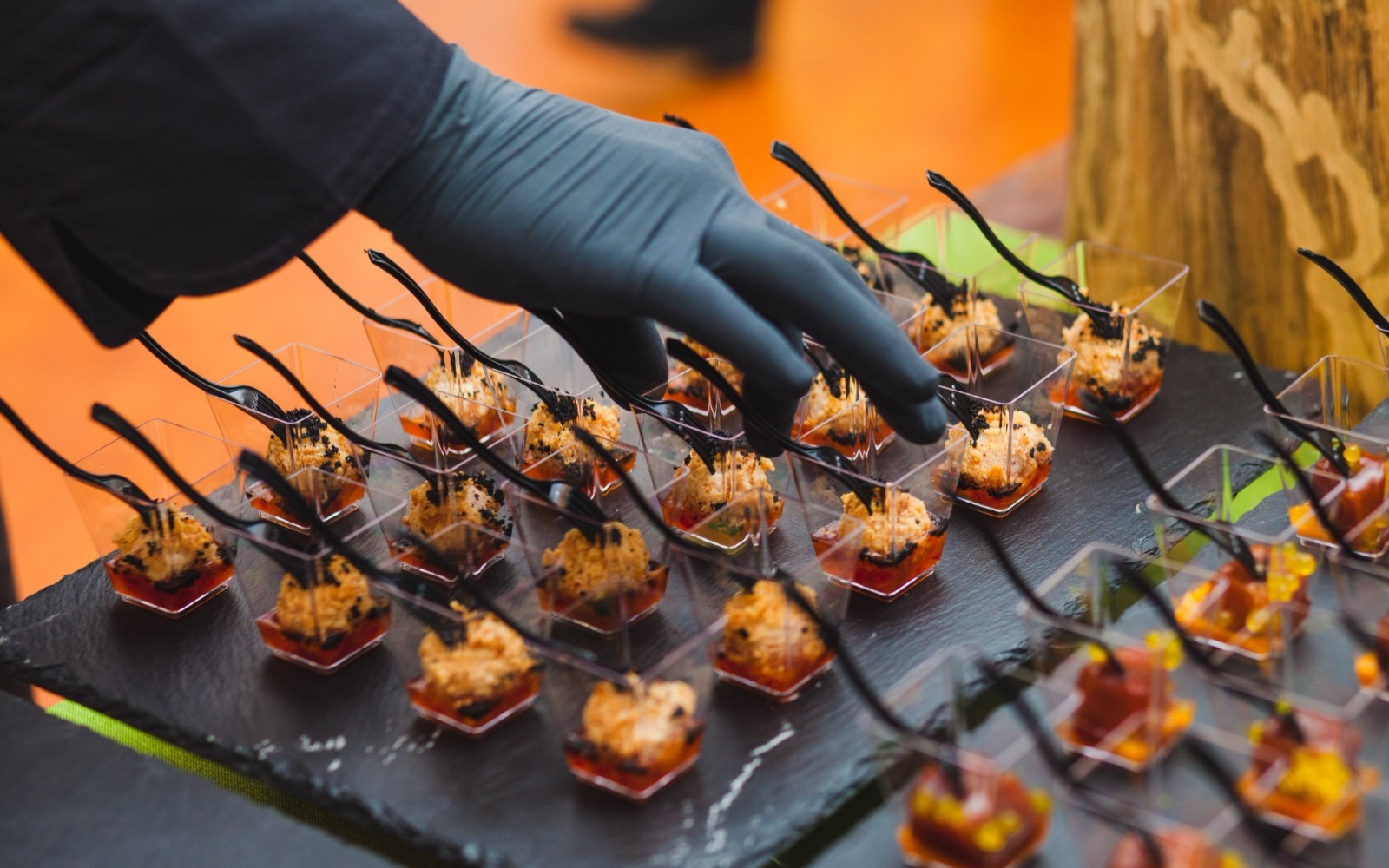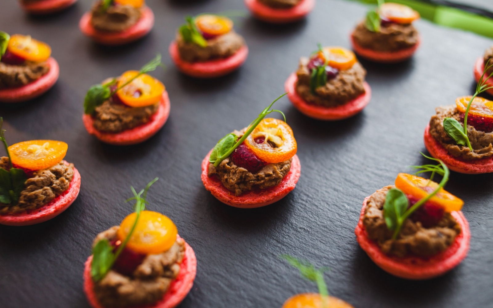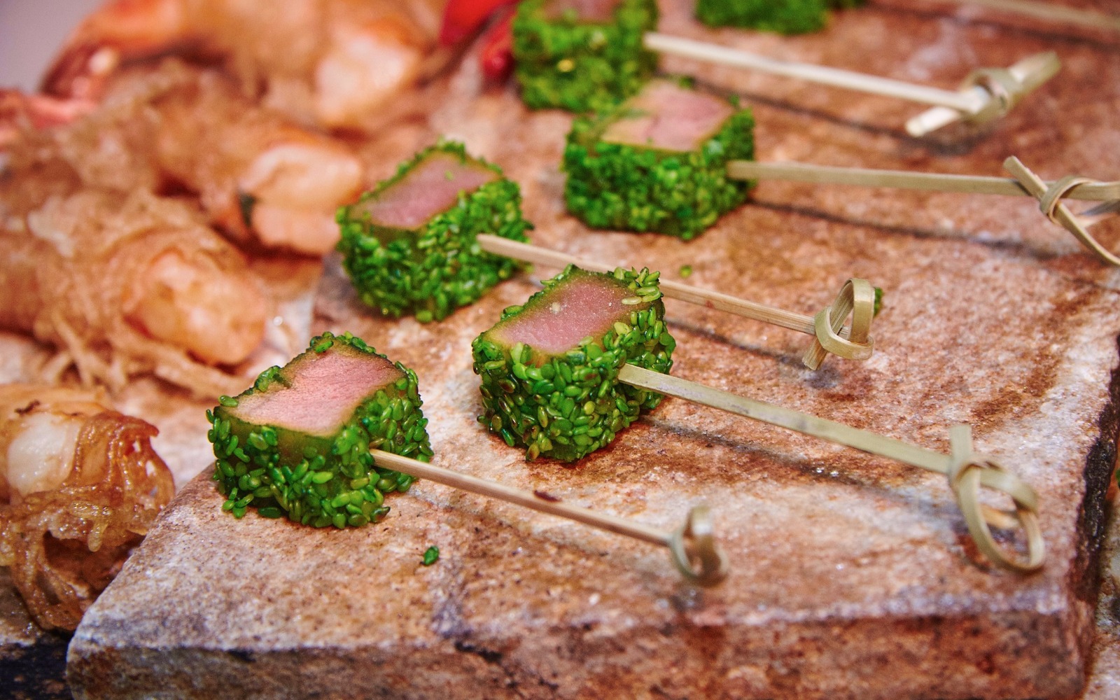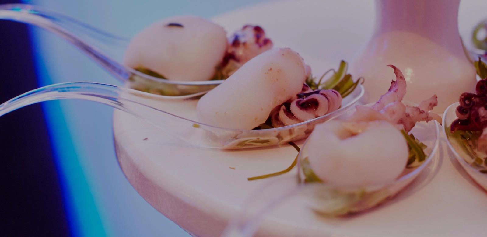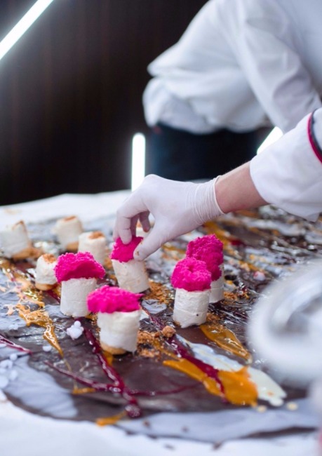 Напитки и закуски официанты подают гостям в обнос. Такой формат предполагает удобные небольшие закуски на один укус и исключает использование фраже
