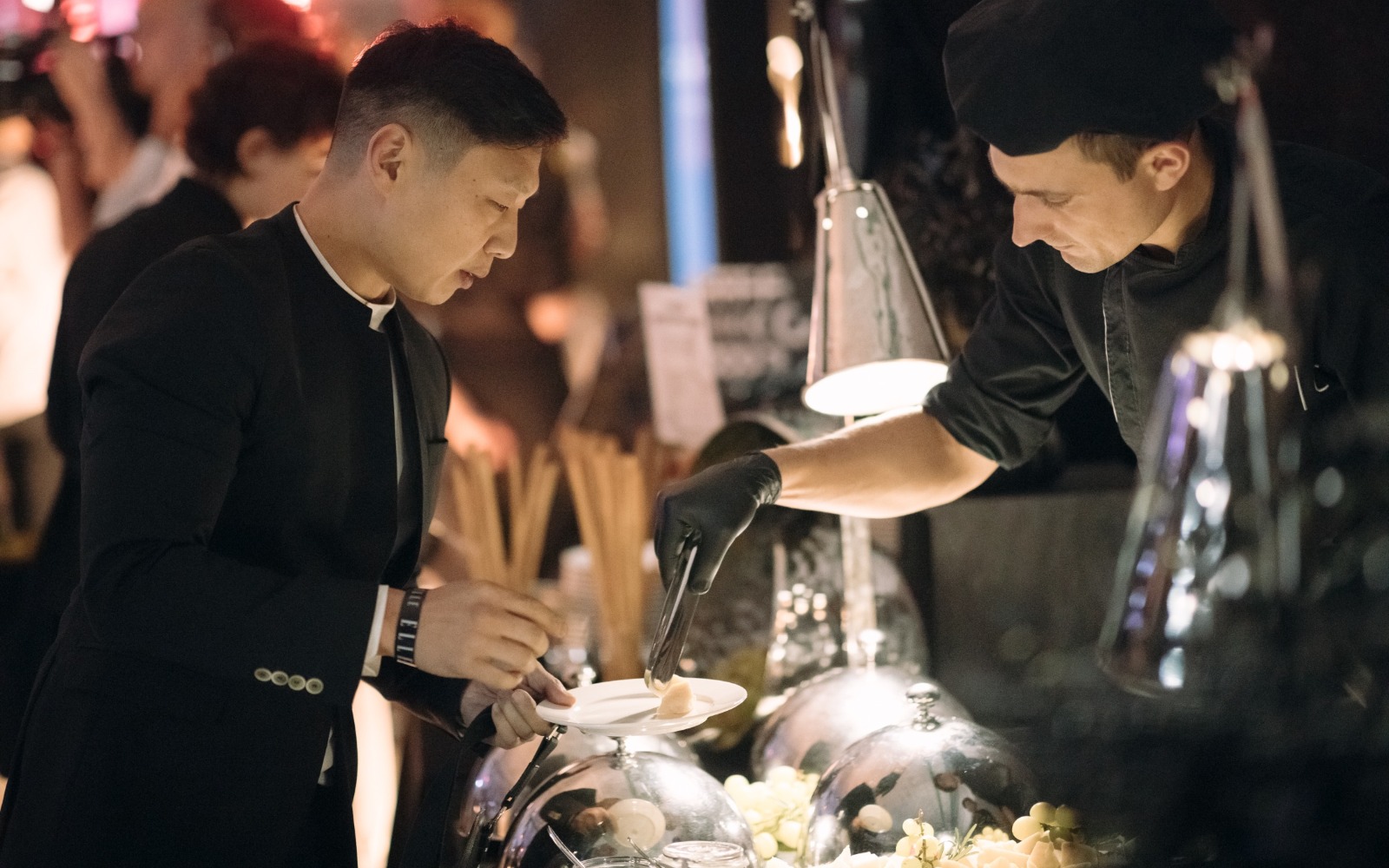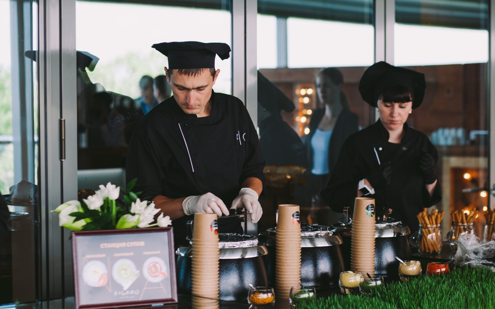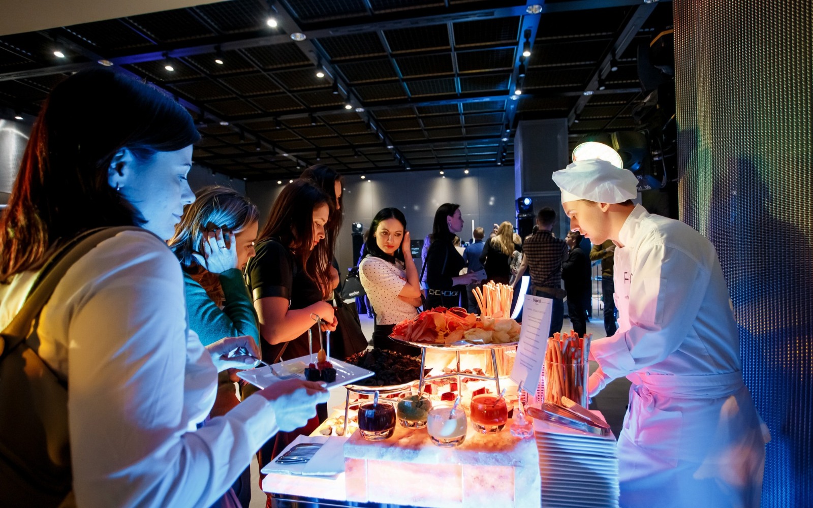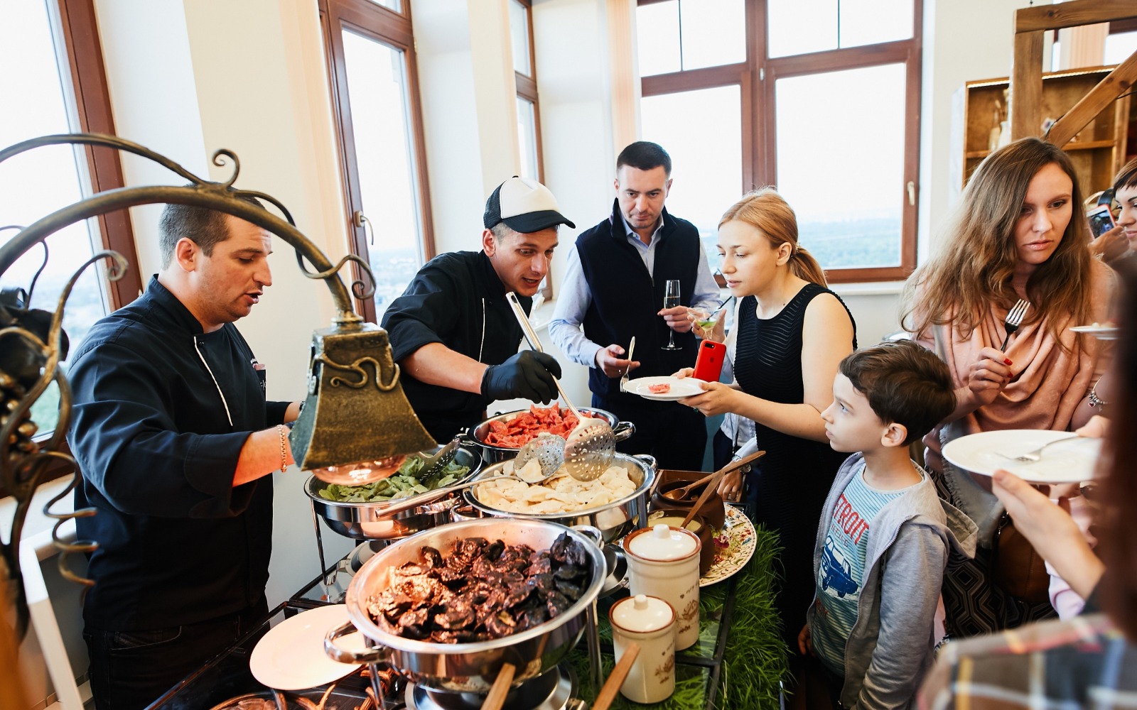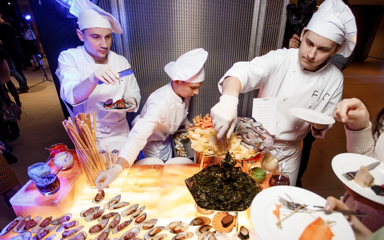 Повара и официанты стоят по длине всей фуршетной линии и помогают гостям определиться с выбором еды и закусок