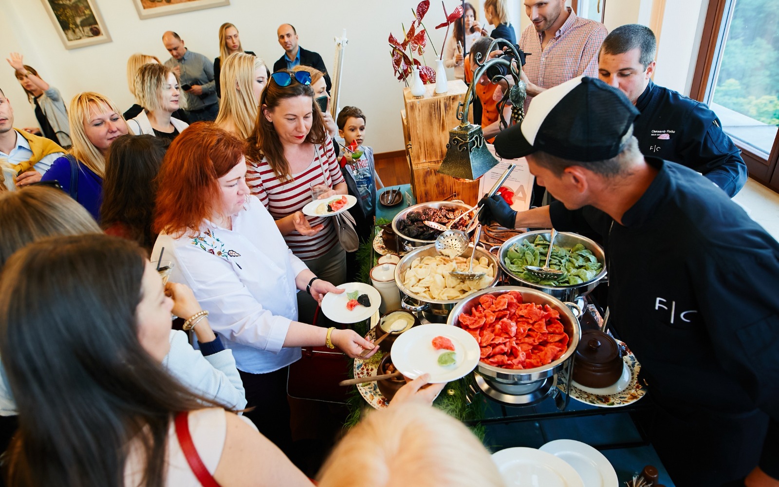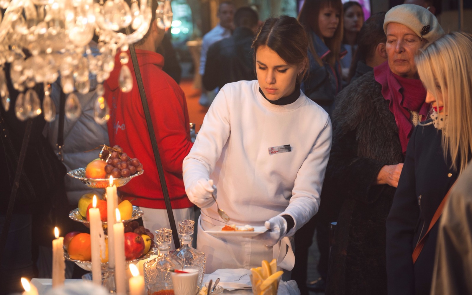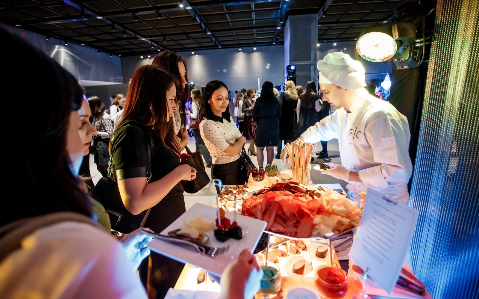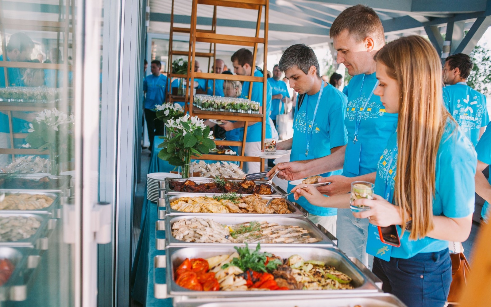 Повара и официанты стоят по длине всей фуршетной линии и помогают гостям определиться с выбором еды и закусок