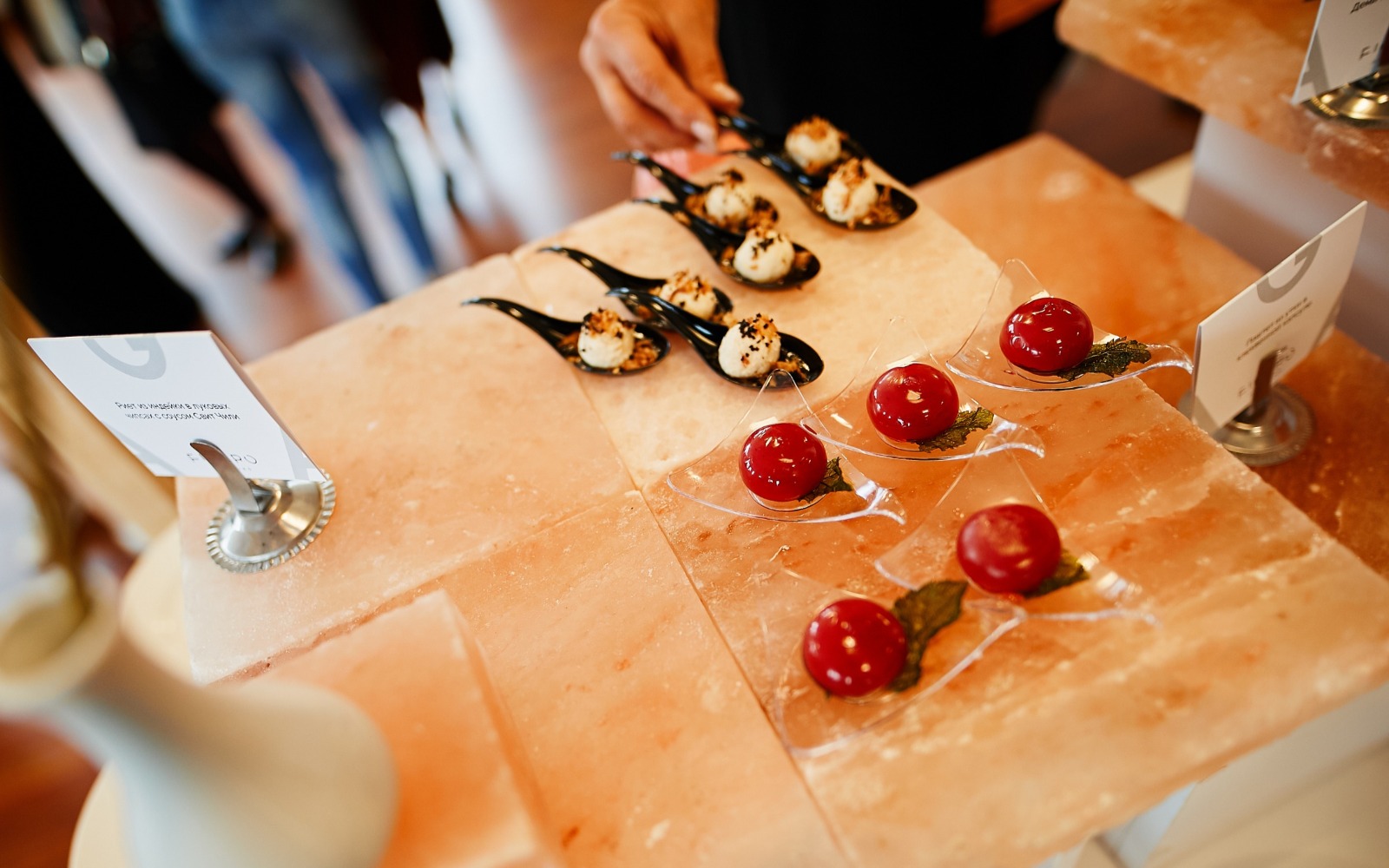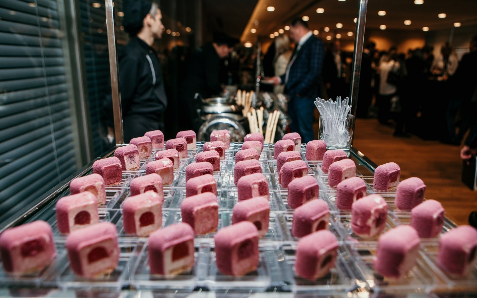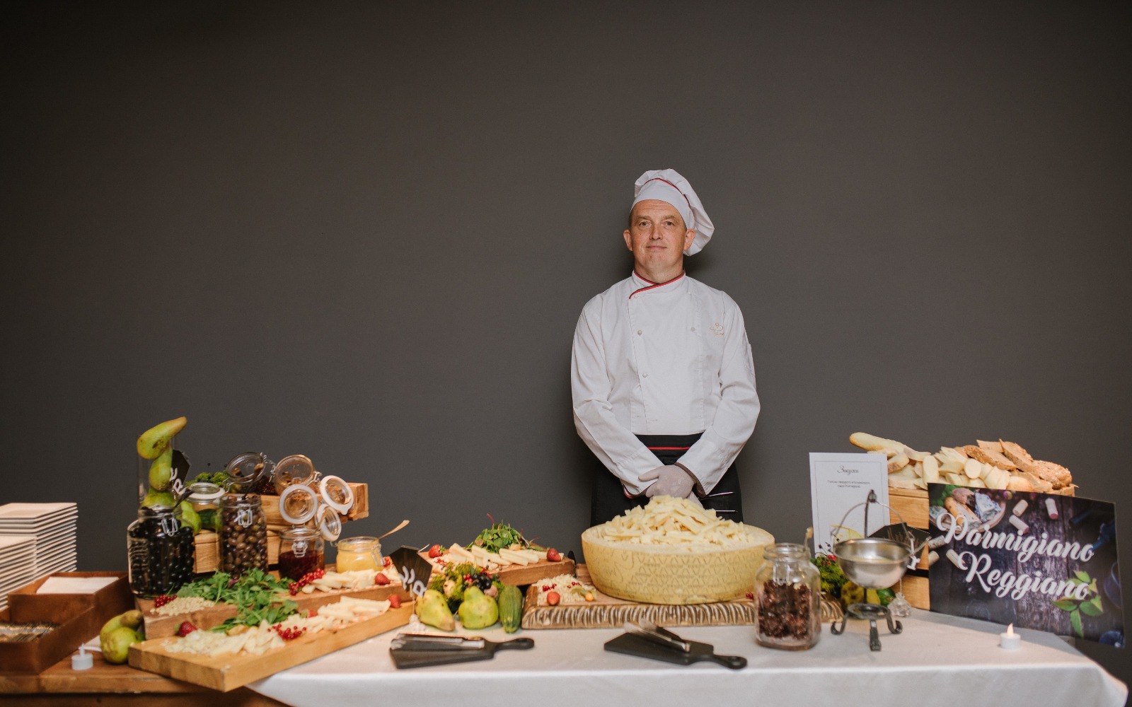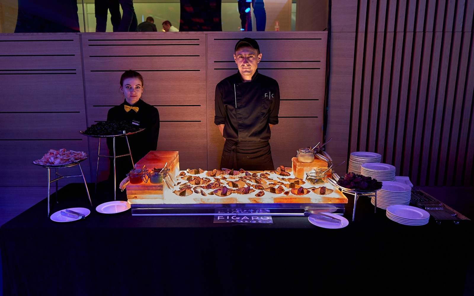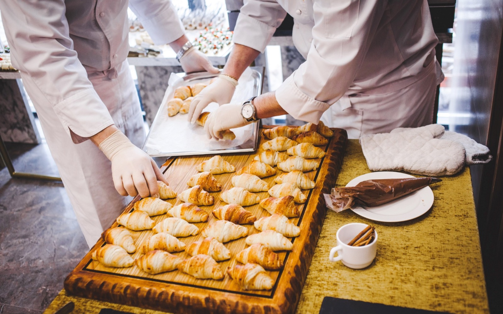 Повара и официанты стоят по длине всей фуршетной линии и помогают гостям определиться с выбором еды и закусок