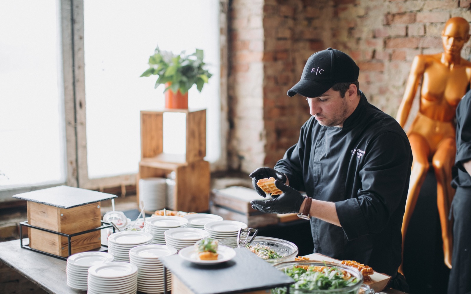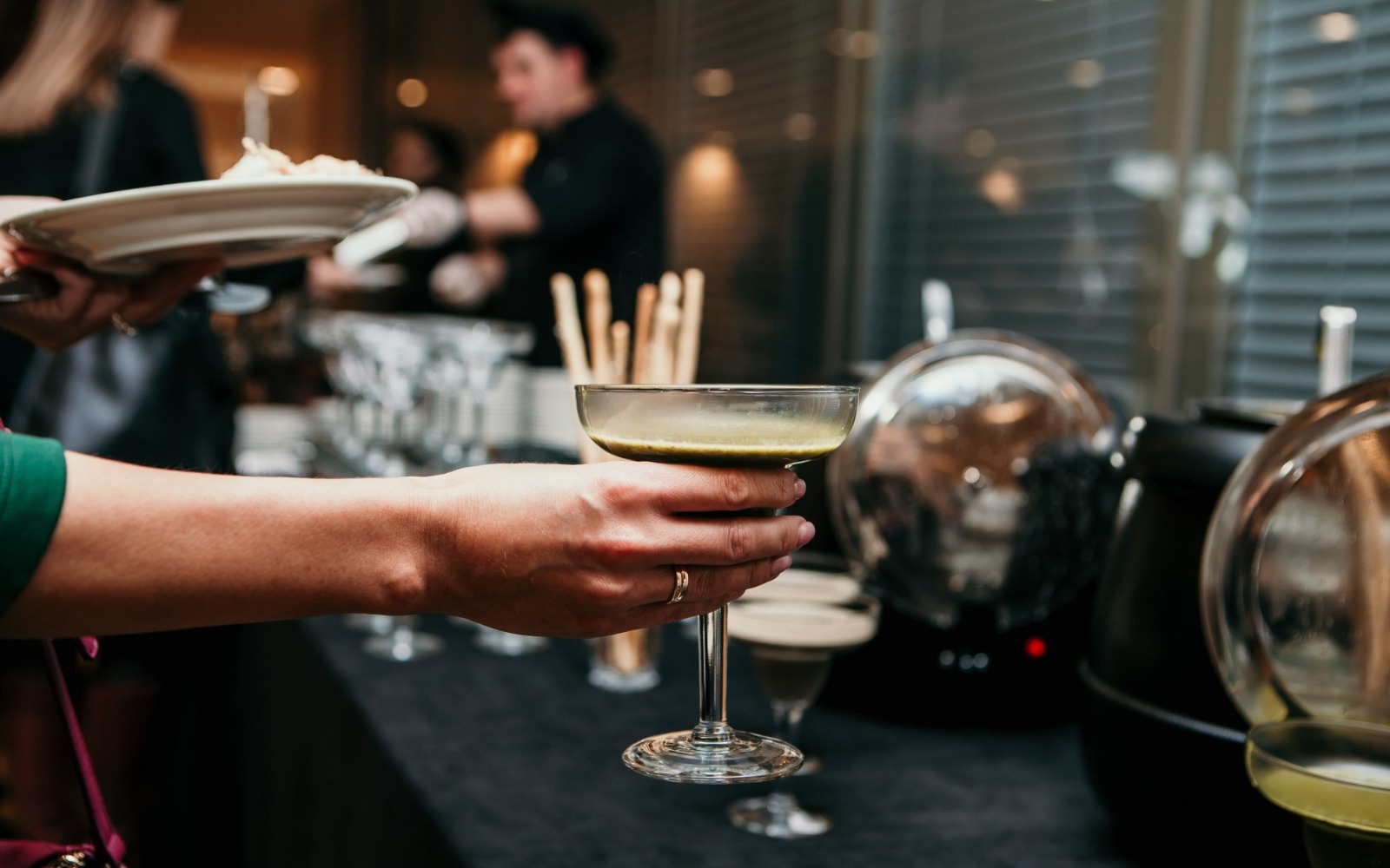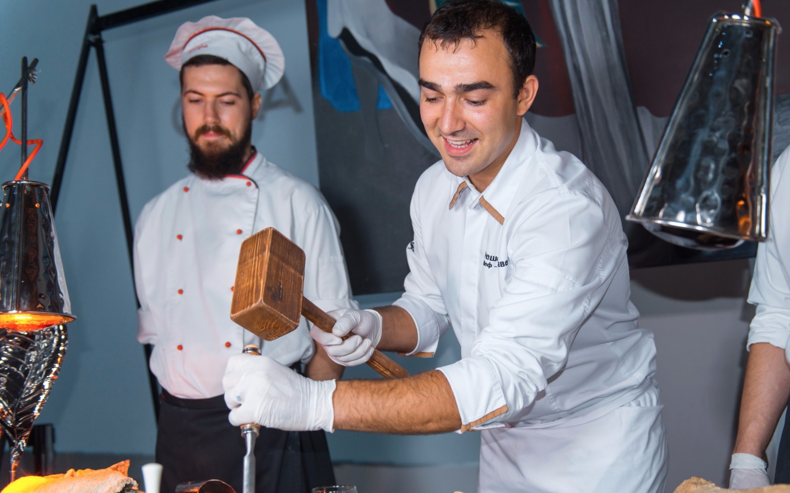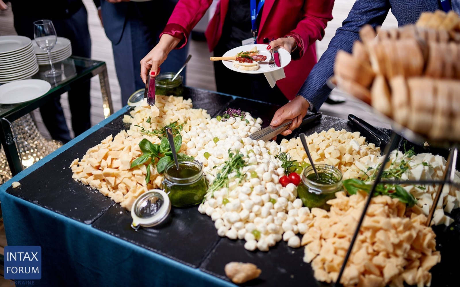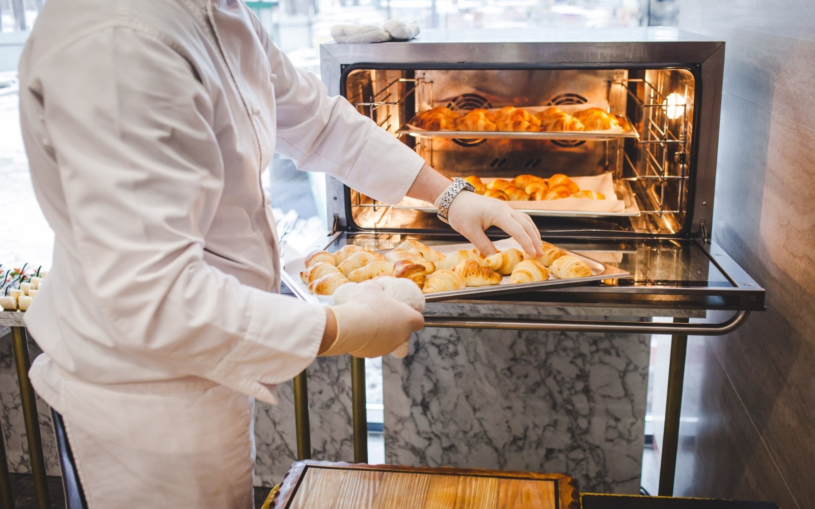 Повара и официанты стоят по длине всей фуршетной линии и помогают гостям определиться с выбором еды и закусок
