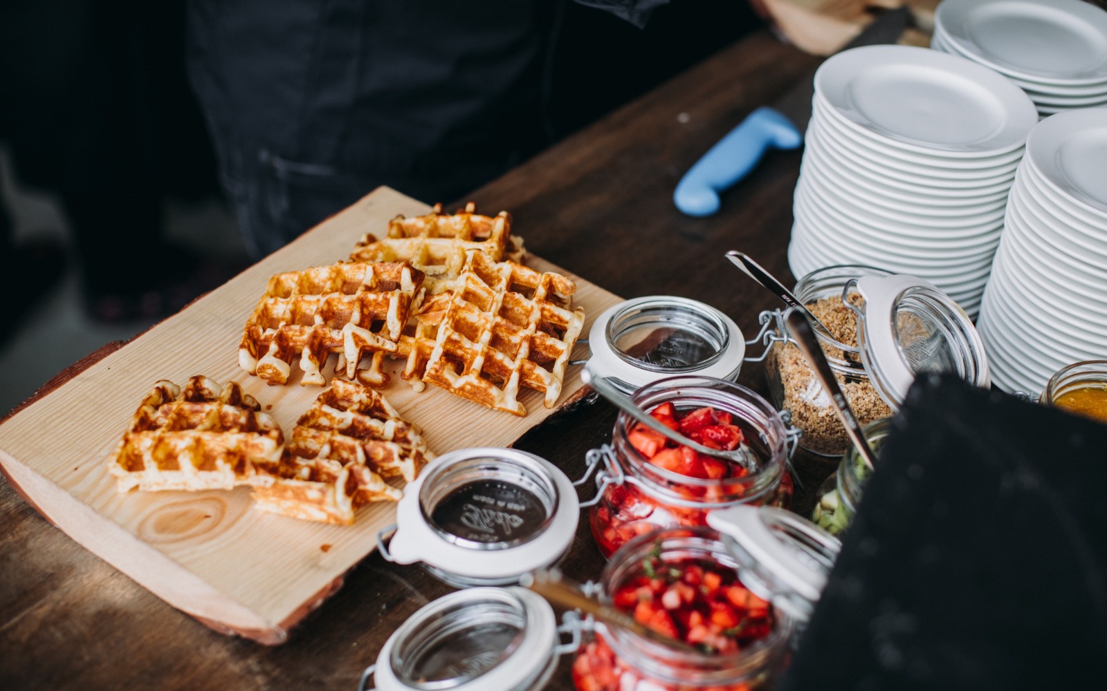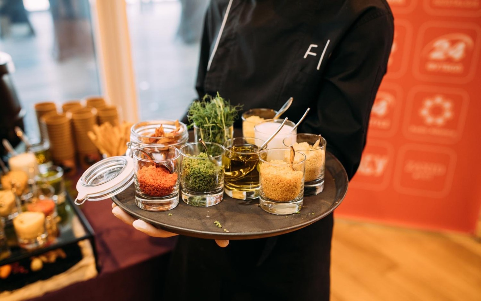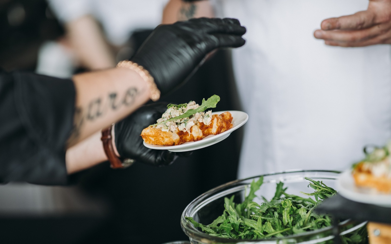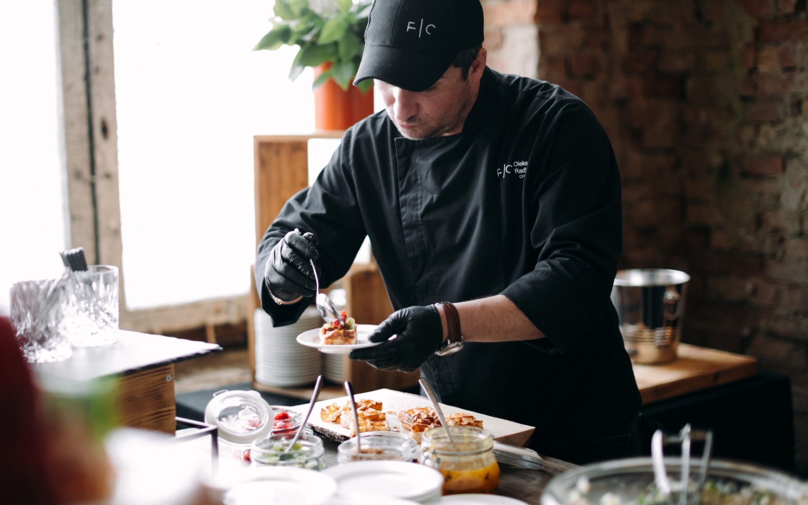 Повара и официанты стоят по длине всей фуршетной линии и помогают гостям определиться с выбором еды и закусок