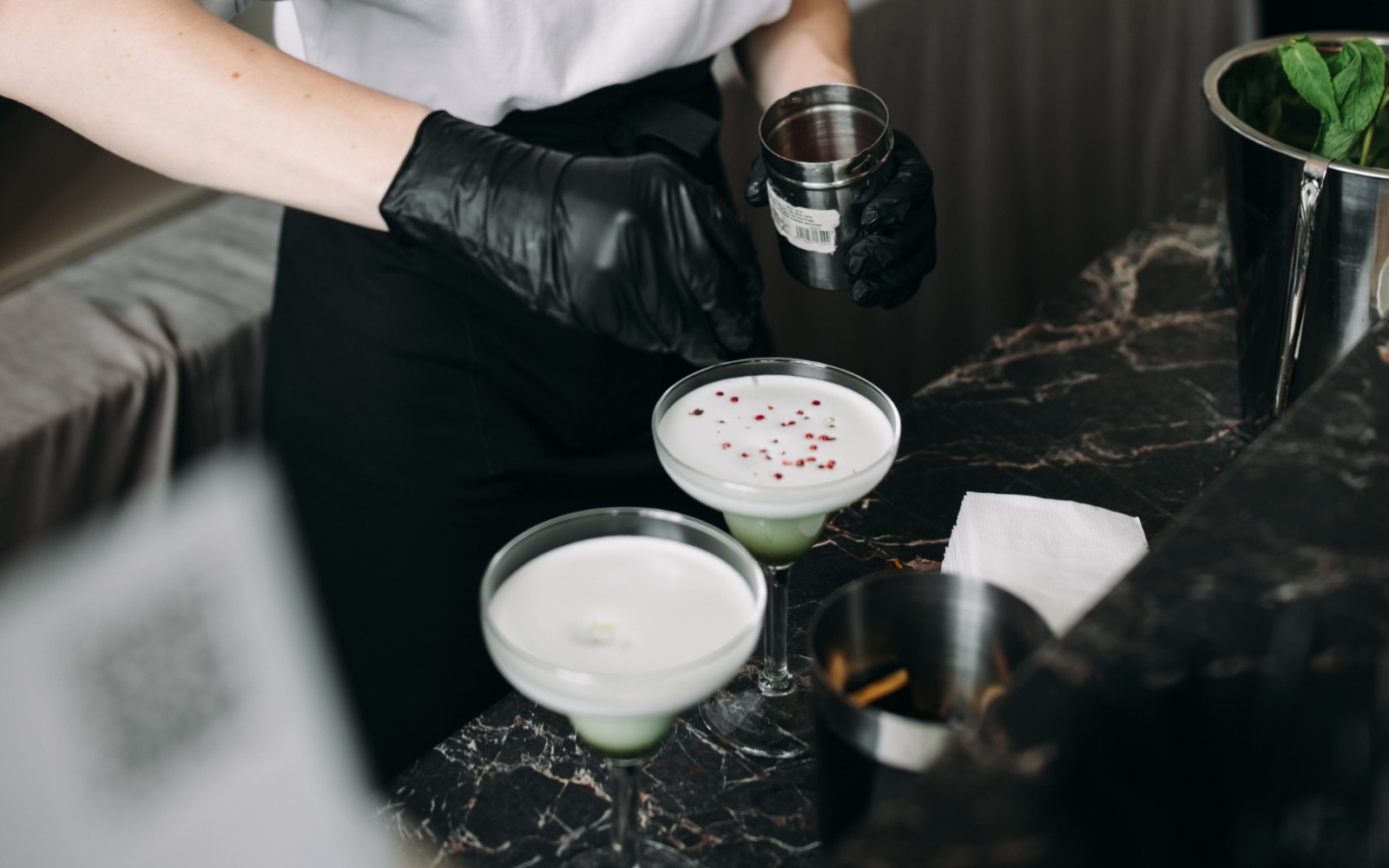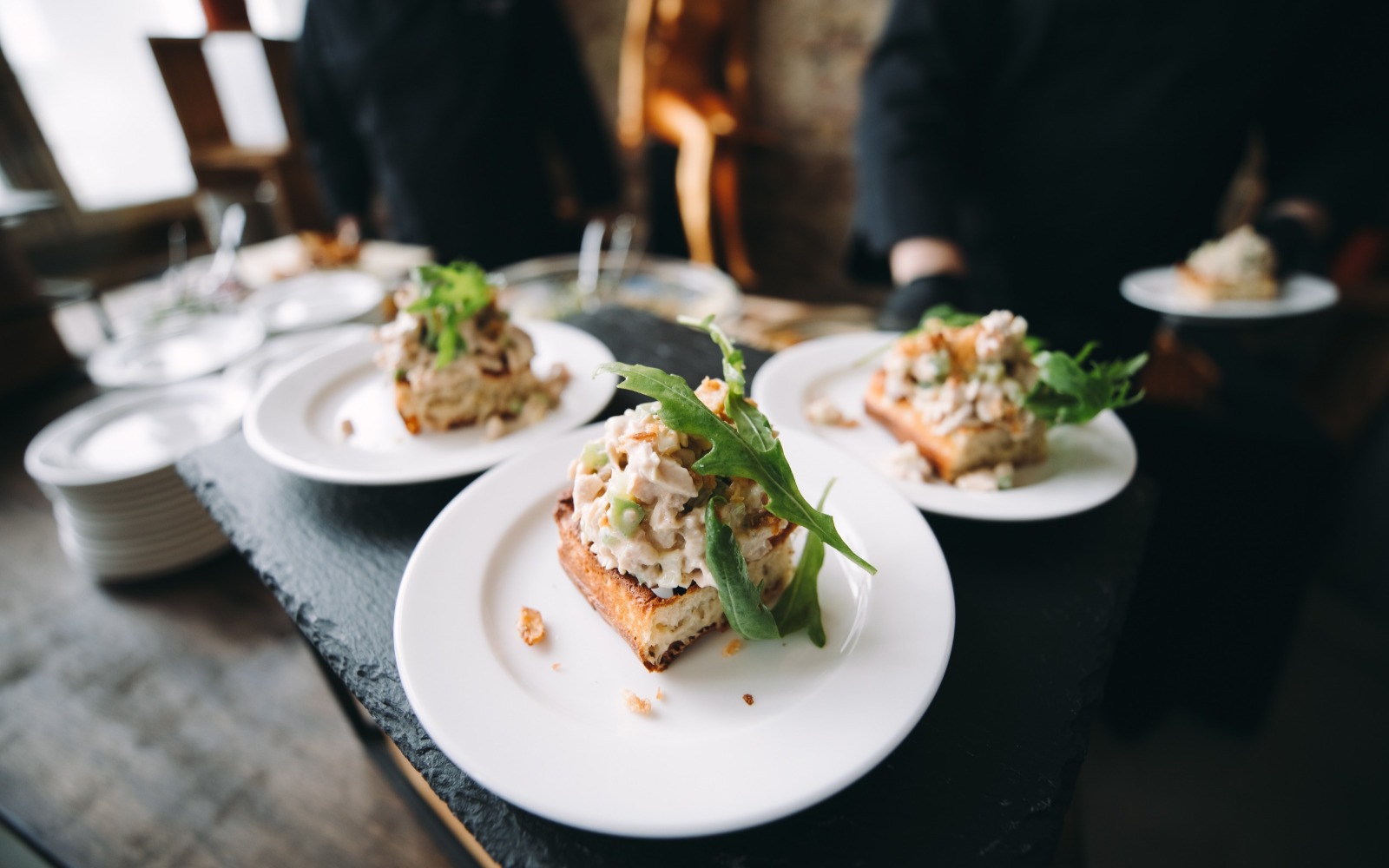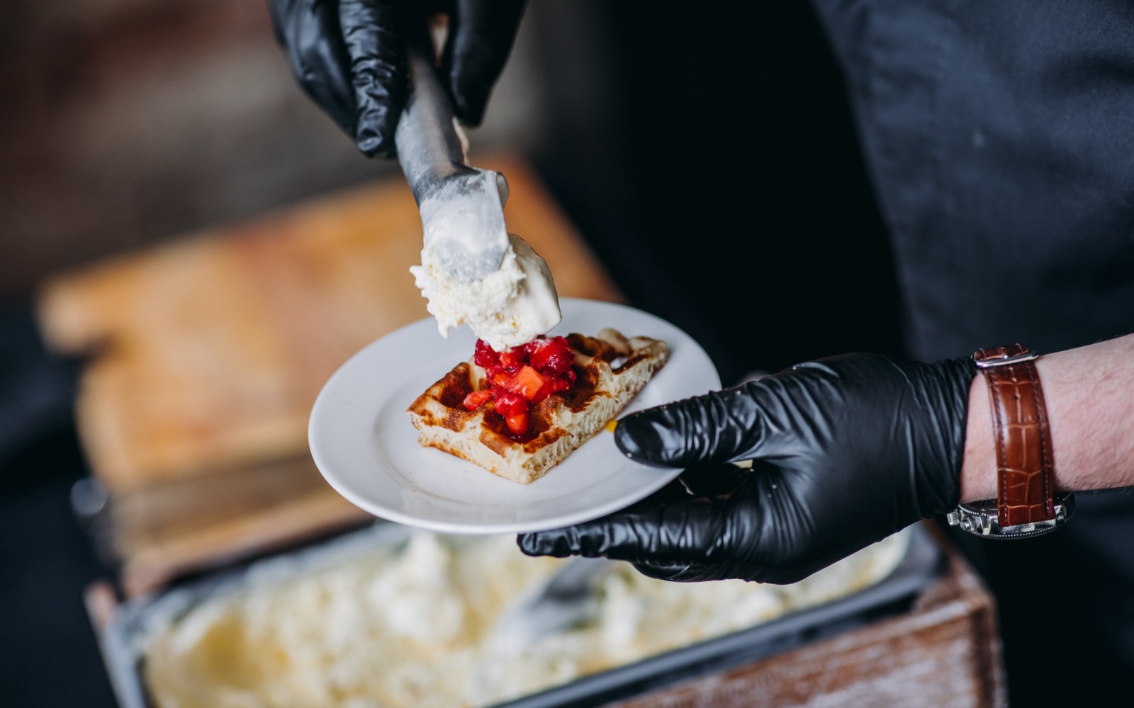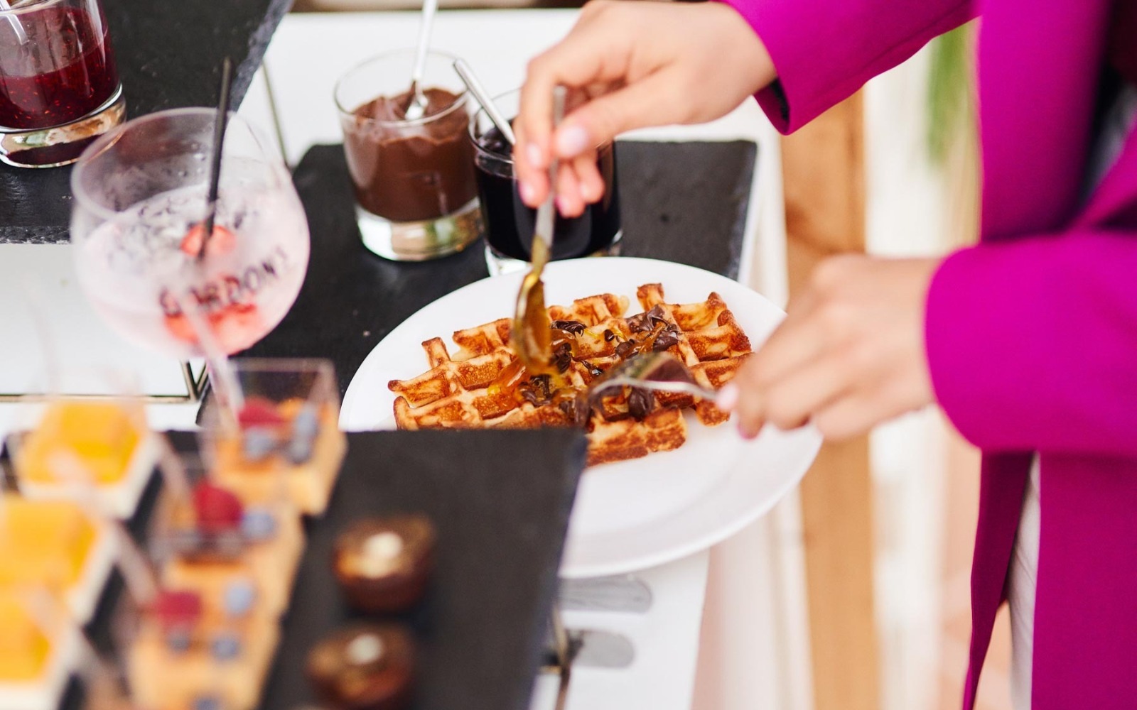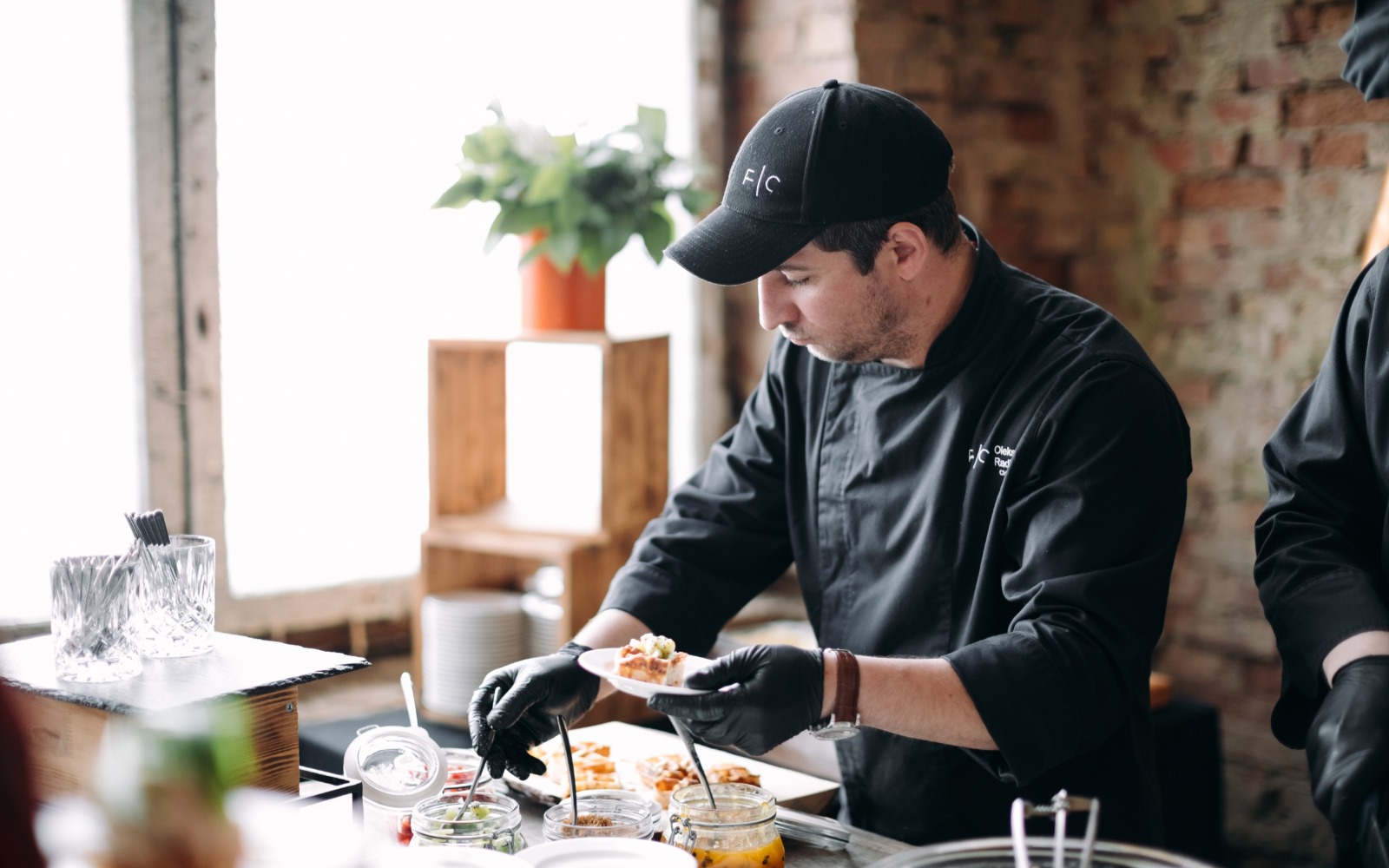 Повара и официанты стоят по длине всей фуршетной линии и помогают гостям определиться с выбором еды и закусок