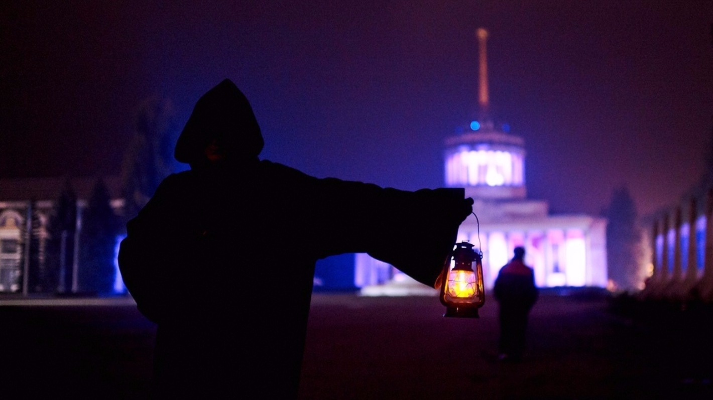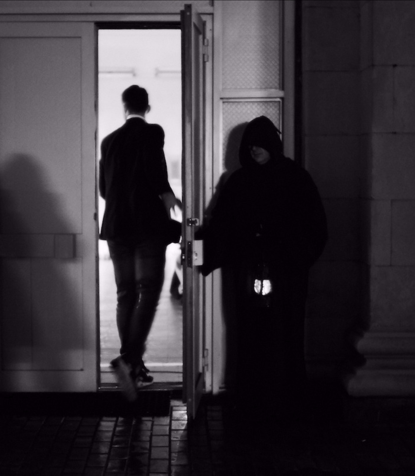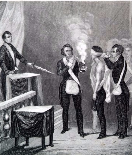 Чоловіки в чорних плащах зі старовинними ліхтарями в руках зустрічають гостей біля входу. Вони простягають руку гостю, який повинен потиснути її таємним рукостисканням масонів. Після вони проводять гостей довгими, темними, підвальними коридорами в загальний зал