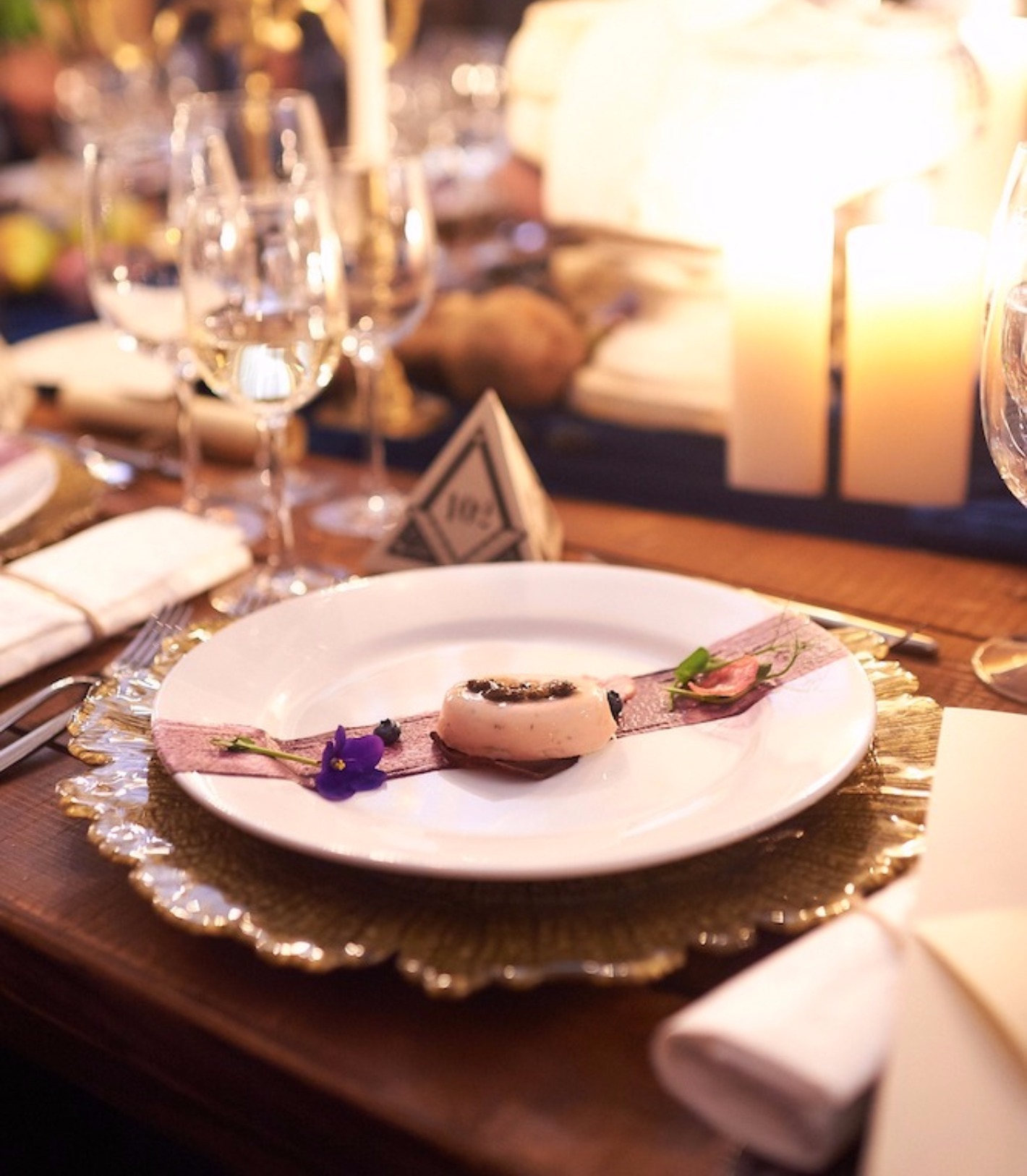 Виноградна сфера з ікрою в лаймовому мусі з сиру Рікотта і каперсами, томлені в винному соусі, символізує закрите життя Товариства Масонів всередині оболонки, наповненої таємницями і легендами