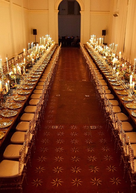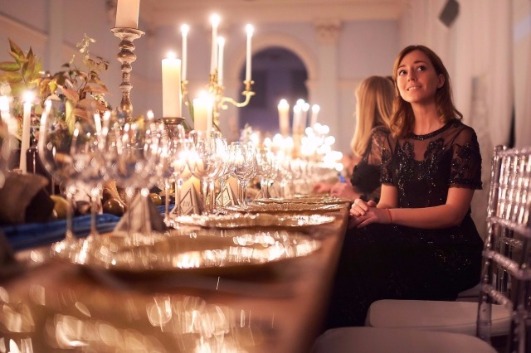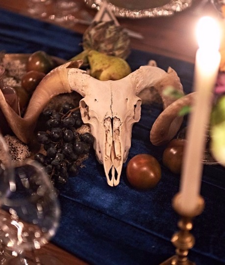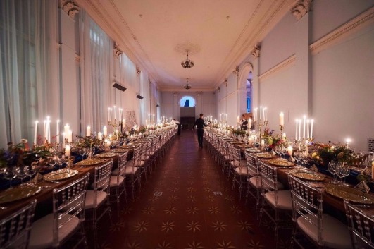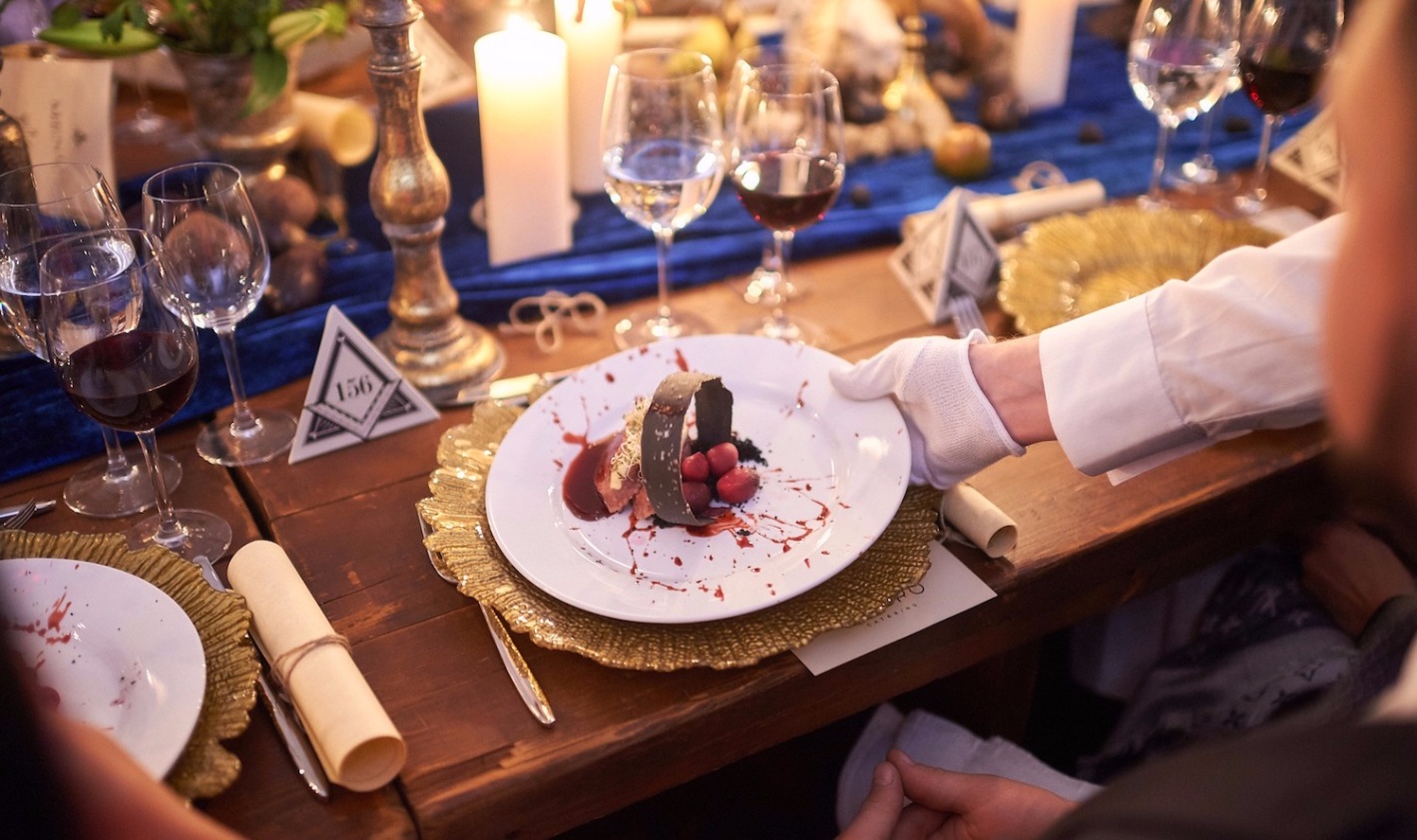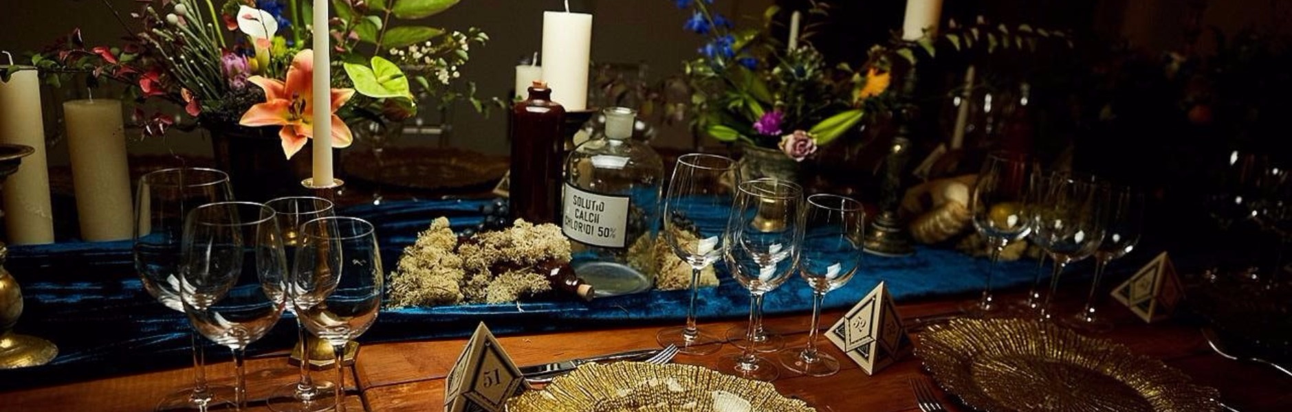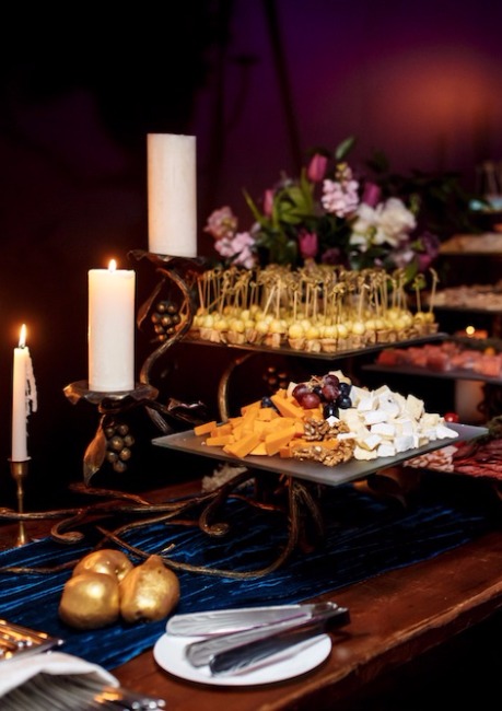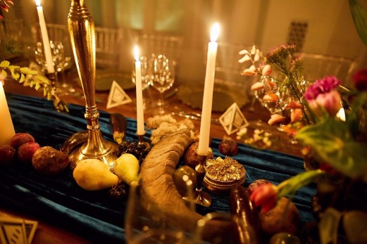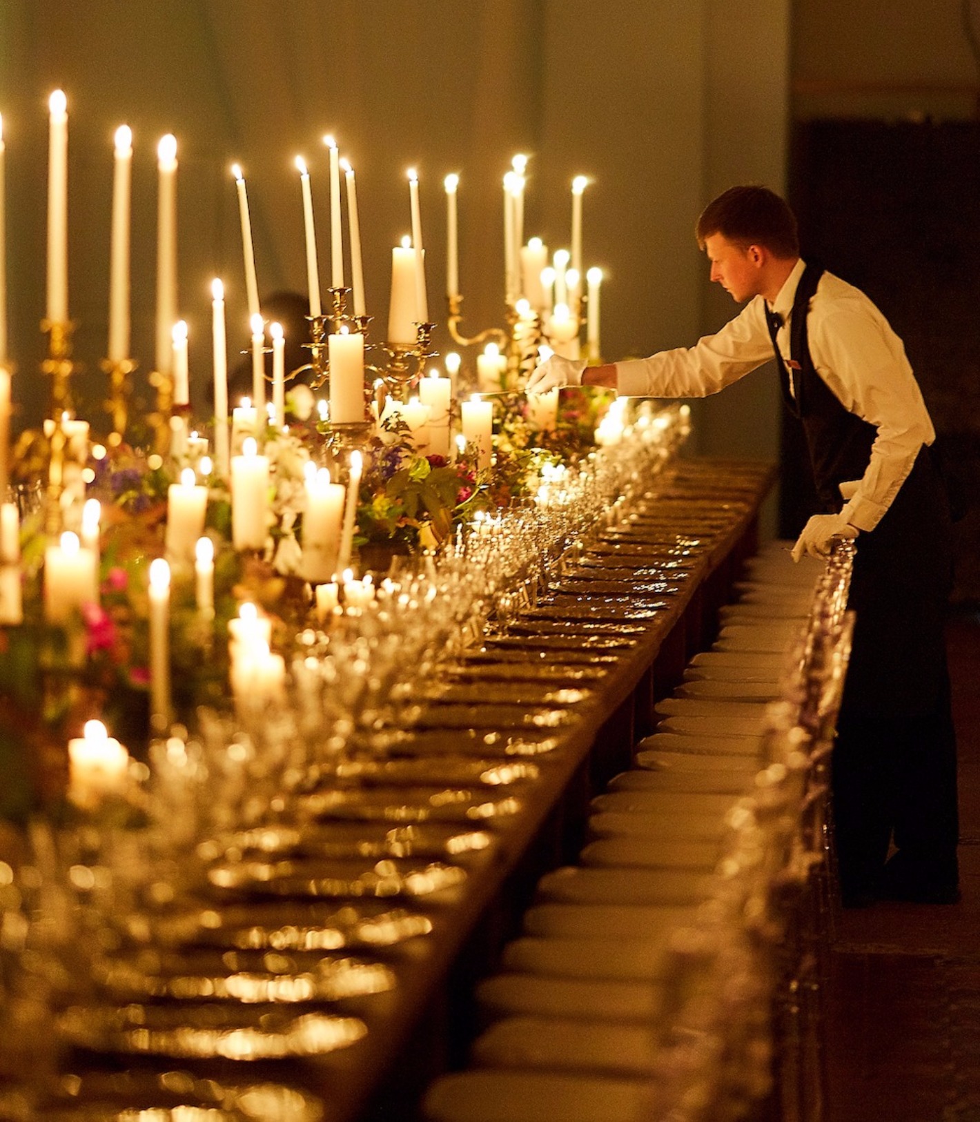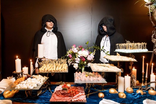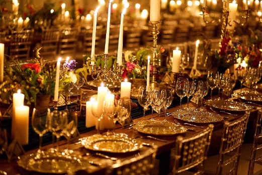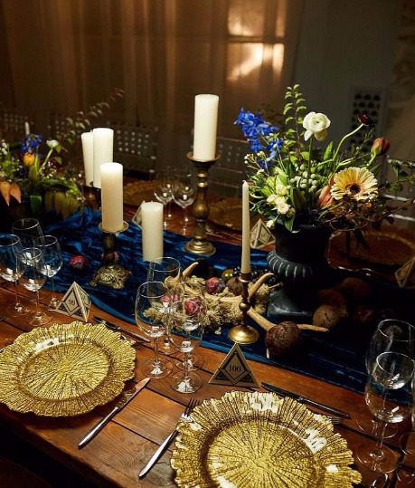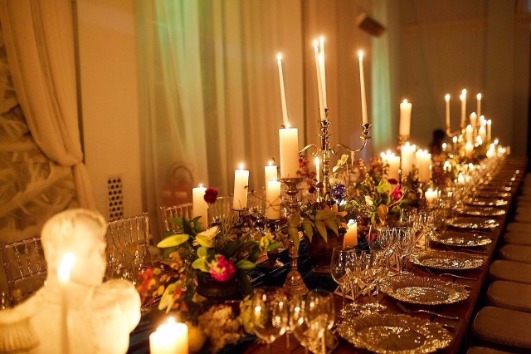 Довгий стіл з масивного дерева декорується синім оксамитом, золотими свічникам і шикарними композиціями з квітів і фруктів. Гра світла і вогню на столових приладах додадуть нотку таємничості і загадковості