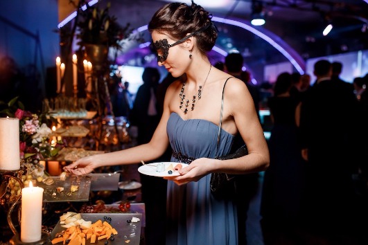 Заходи в стилі Масони можна застосувати і в форматі фуршет. Масивні дерев'яні столи фуршетної лінії декоруються синім оксамитом, золотими свічниками і шикарними композиціями з квітів і фруктів. У форматі фуршет ми можемо не прив'язуватися до спеціальних страв і наповнити меню асортиментом закусок і страв виходячи з побажань клієнта