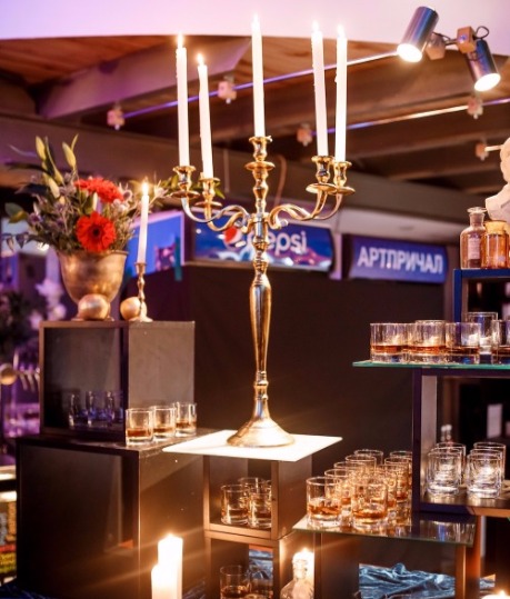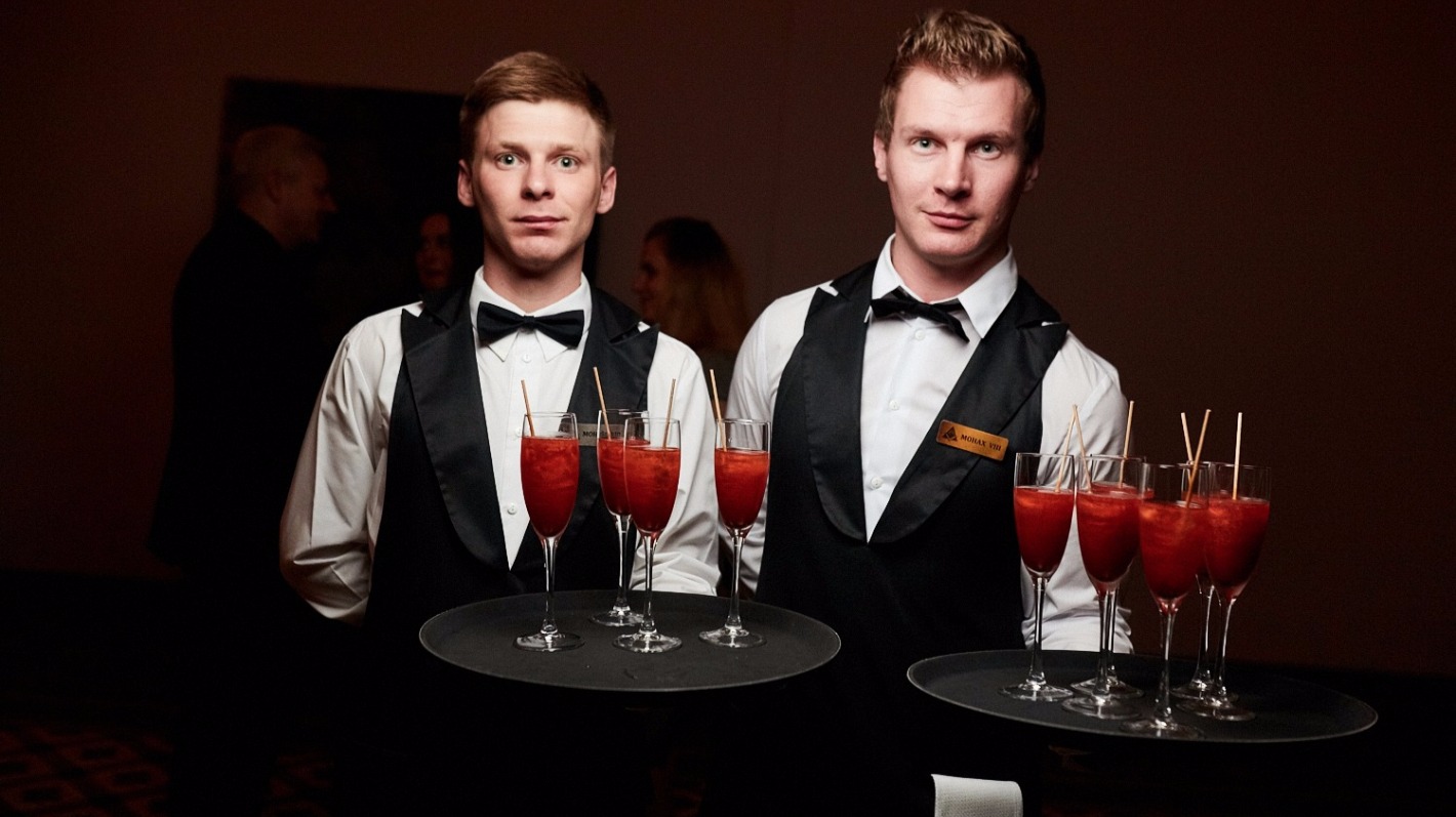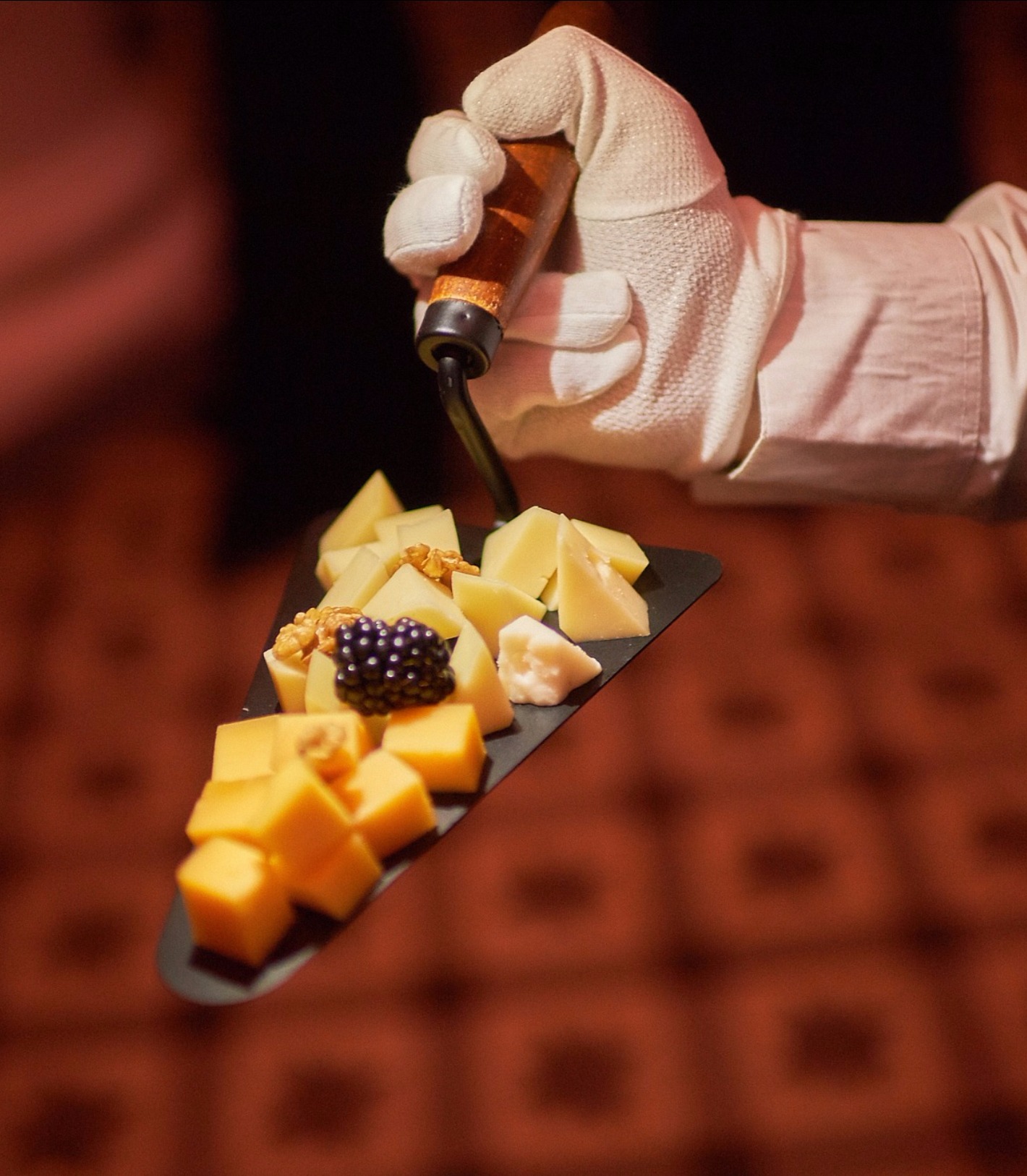 Гостей зустрічають офіціанти в класичній формі, пригощаючи ігристим вином з бронзовим пилом і карамеллю на паличці. Частування, у вигляді сирного асорті, подається на шпателі, який символізує будову світу