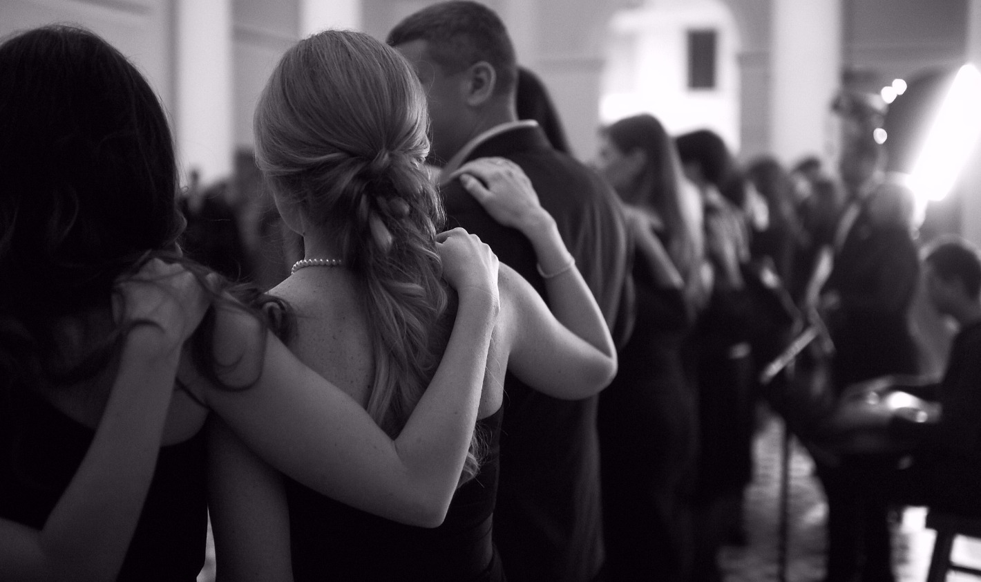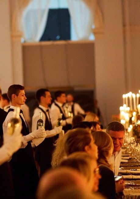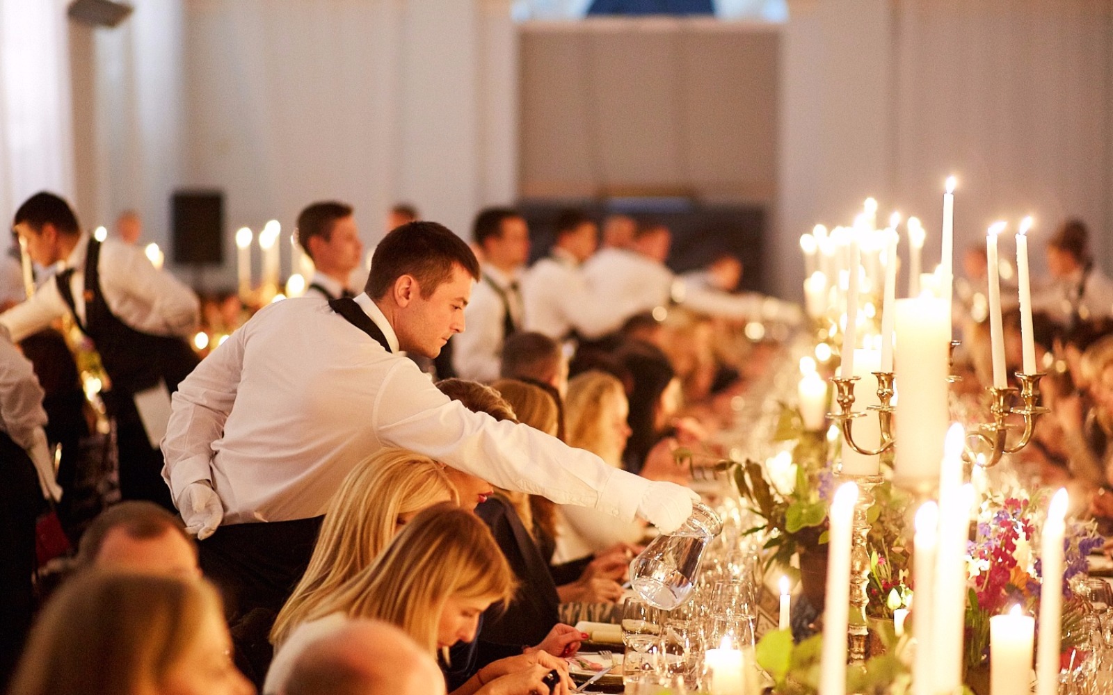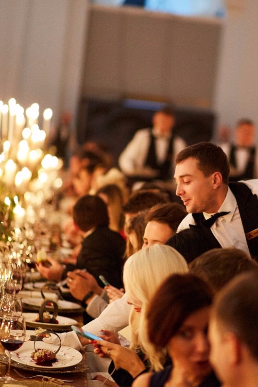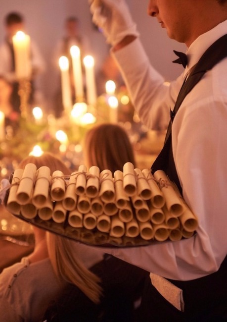 Гостей проводять в зал для розсадження за загальним довгим бенкетним столом. Свічки не горять, в залі тихо. Гості розсідаються по своїх місцях, в той час як, з кроком в 5 чоловік, офіціанти запалюють свічки і роздають другу записку