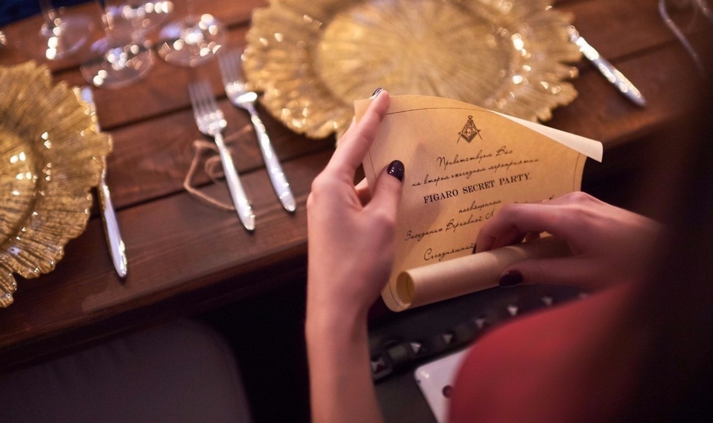 Протягом вечора гостям роздають невеликі папірці-підказки з розповідями про масонів, щоб у них складалося розуміння про все, що відбувається. Перша підказка вручається біля входу