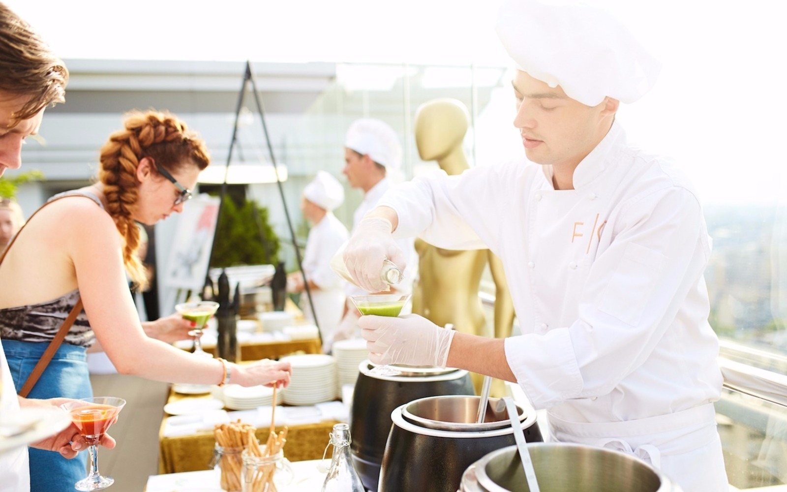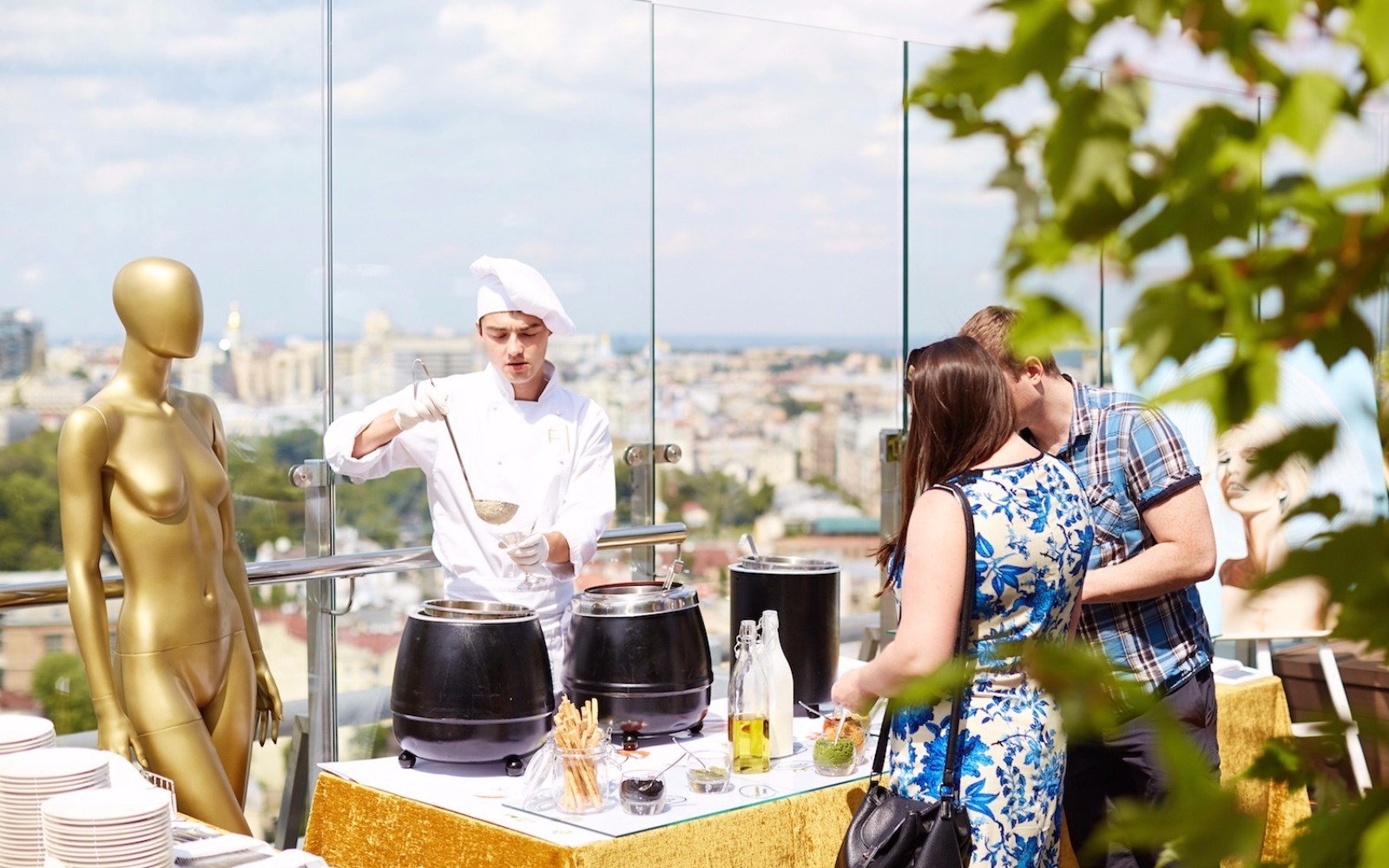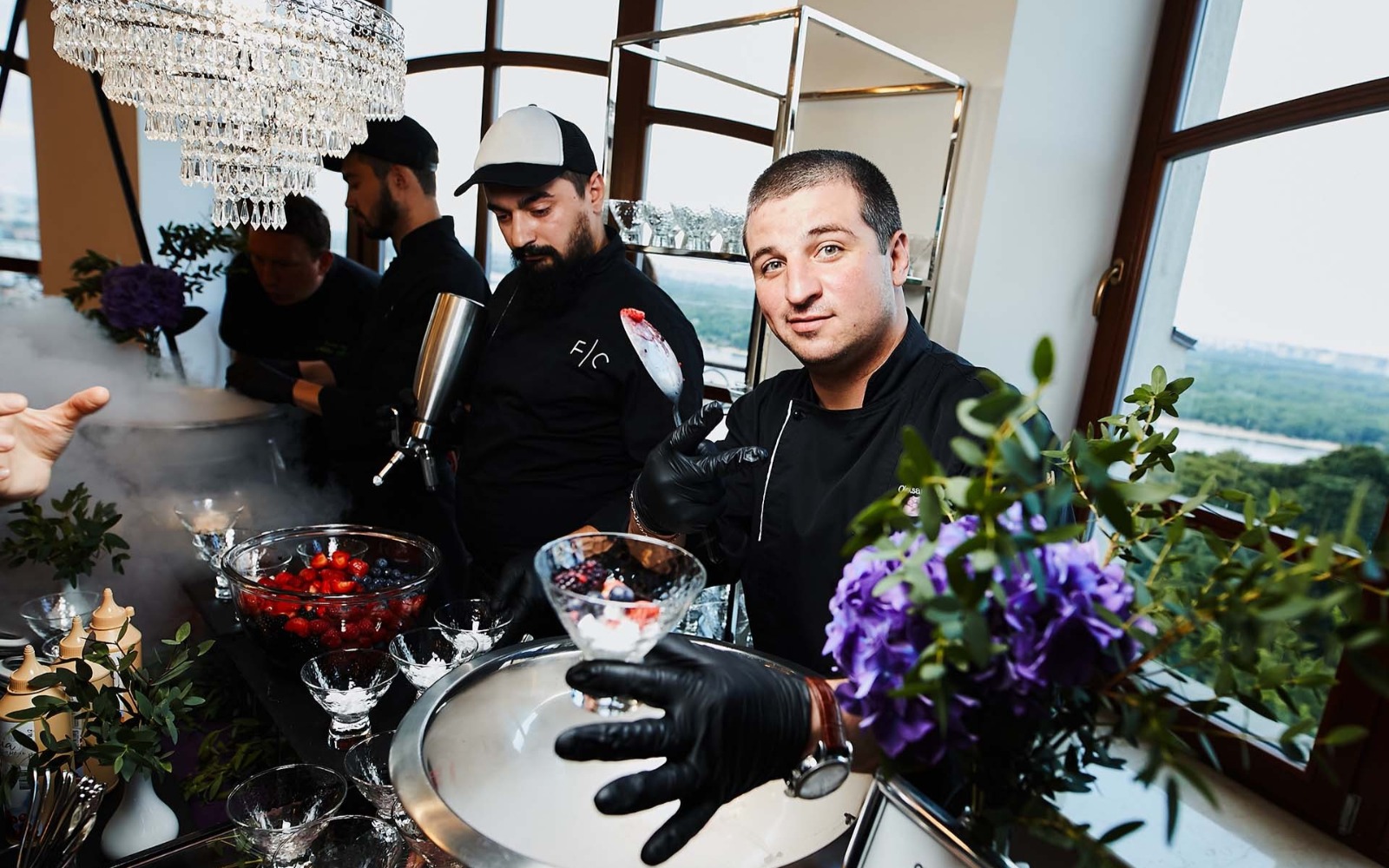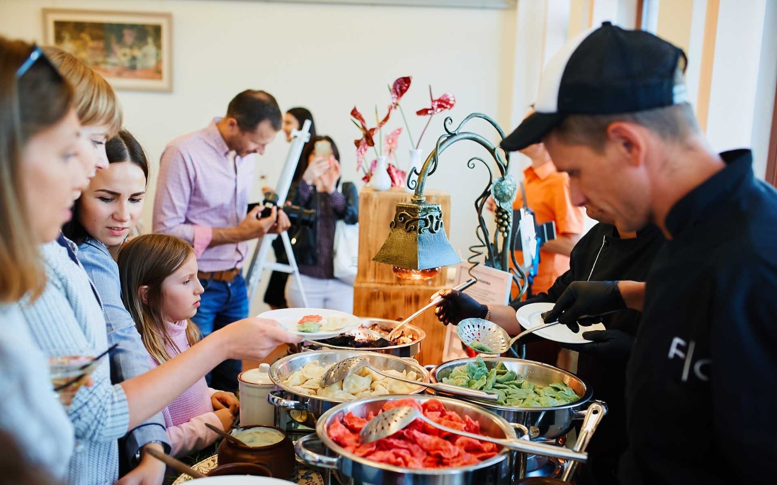 Усміхнені офіціанти й кухарі стоять уздовж фуршетних ліній, допомагаючи гостям визначитися з вибором напоїв, закусок та основних страв.