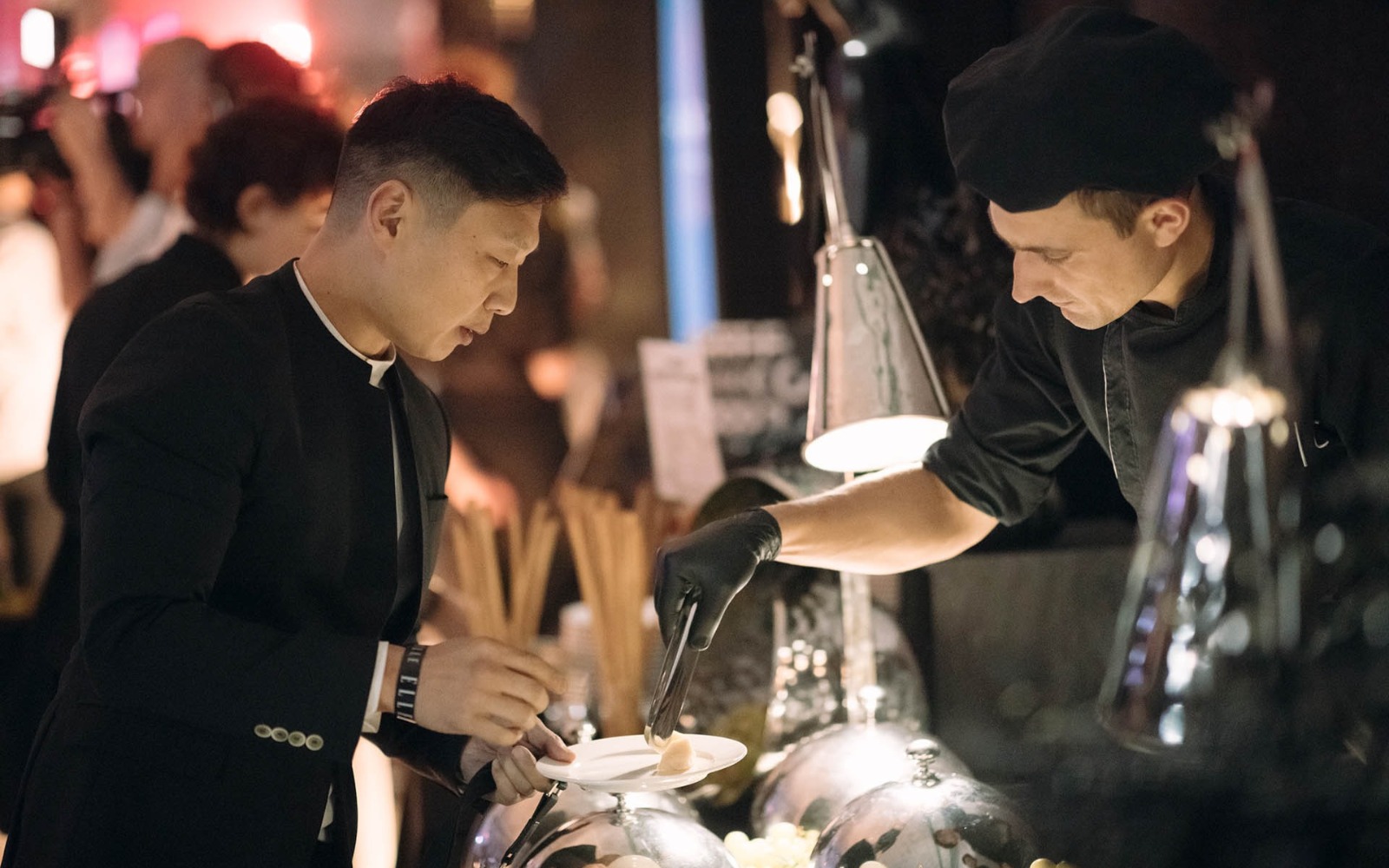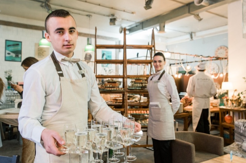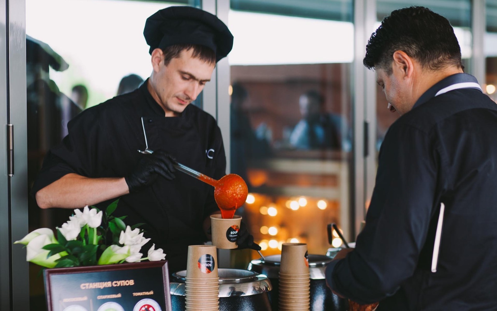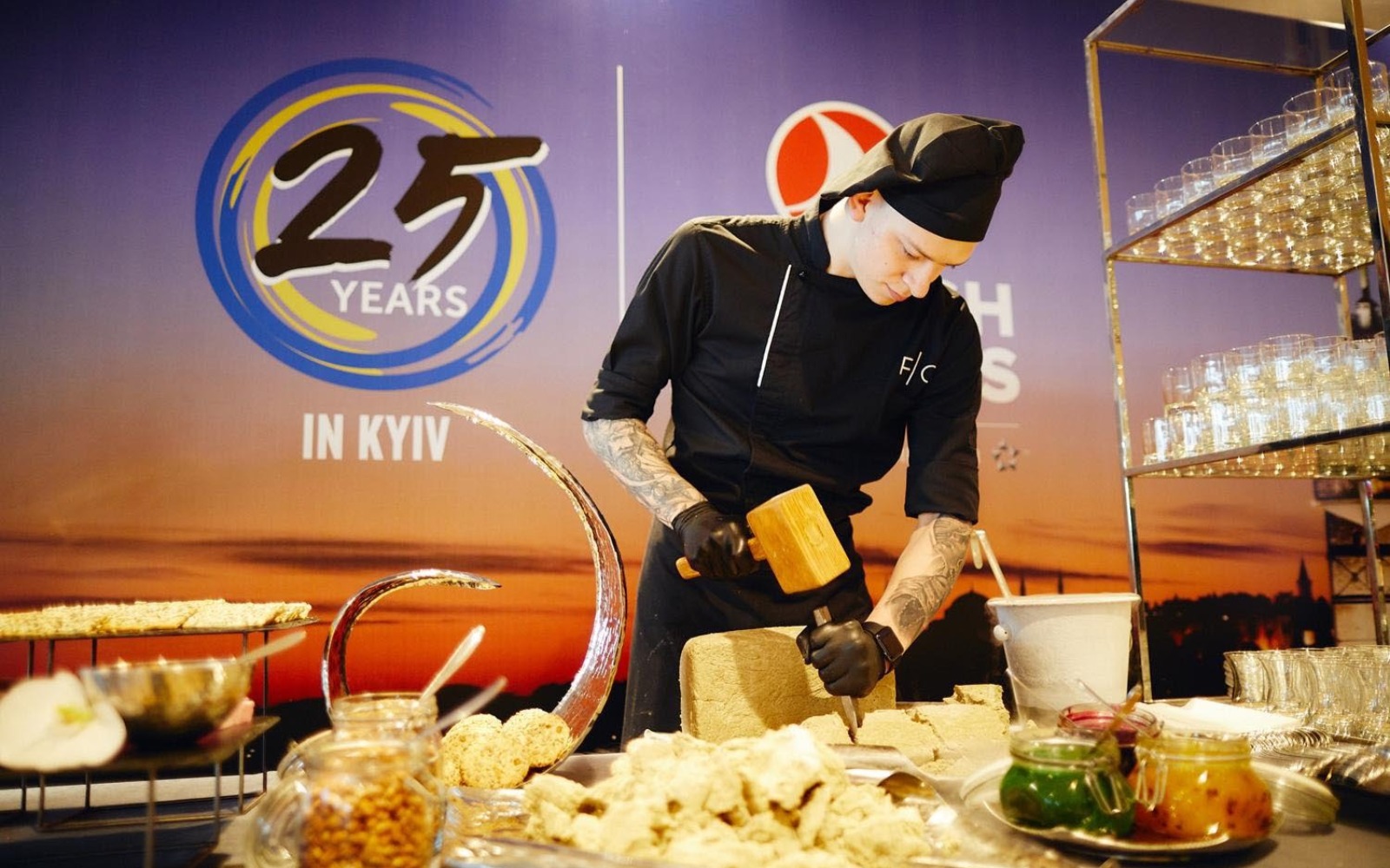 Усміхнені офіціанти й кухарі стоять уздовж фуршетних ліній, допомагаючи гостям визначитися з вибором напоїв, закусок та основних страв.