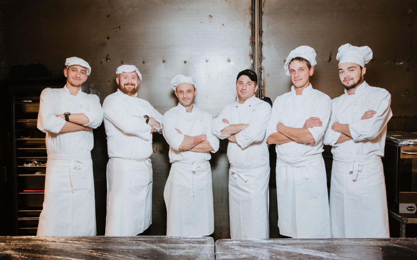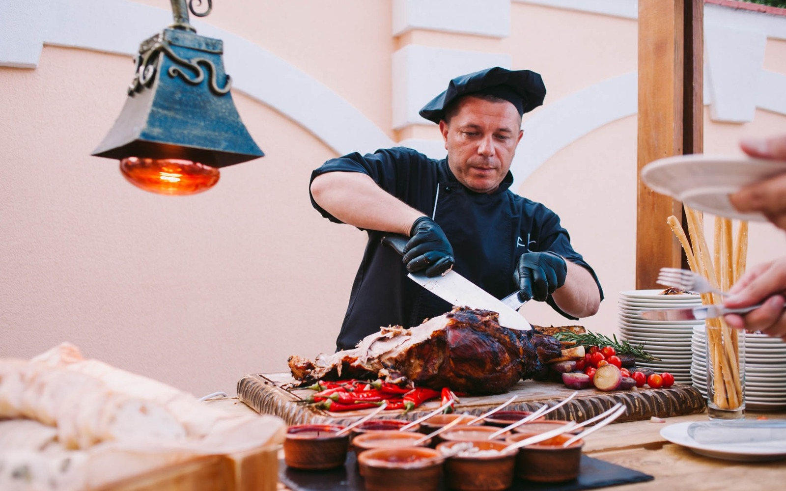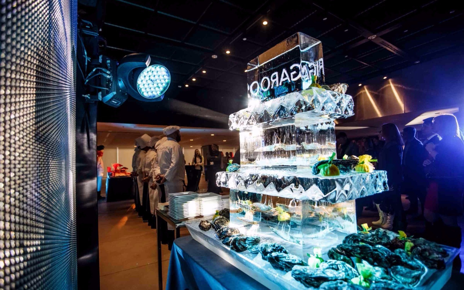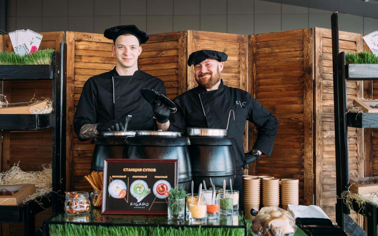 Усміхнені офіціанти й кухарі стоять уздовж фуршетних ліній, допомагаючи гостям визначитися з вибором напоїв, закусок та основних страв.