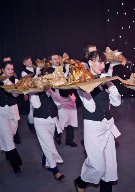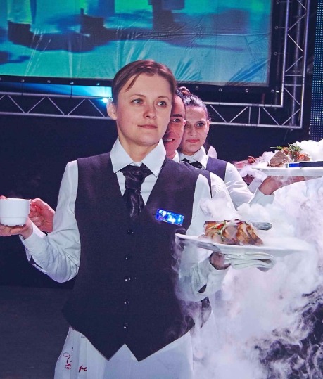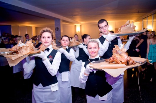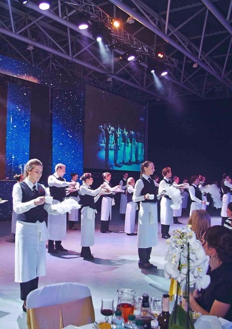 Усміхнені офіціанти рівною колоною з високо піднятою головою винесуть парадом в зал гостям одне з холодних або гарячих страв